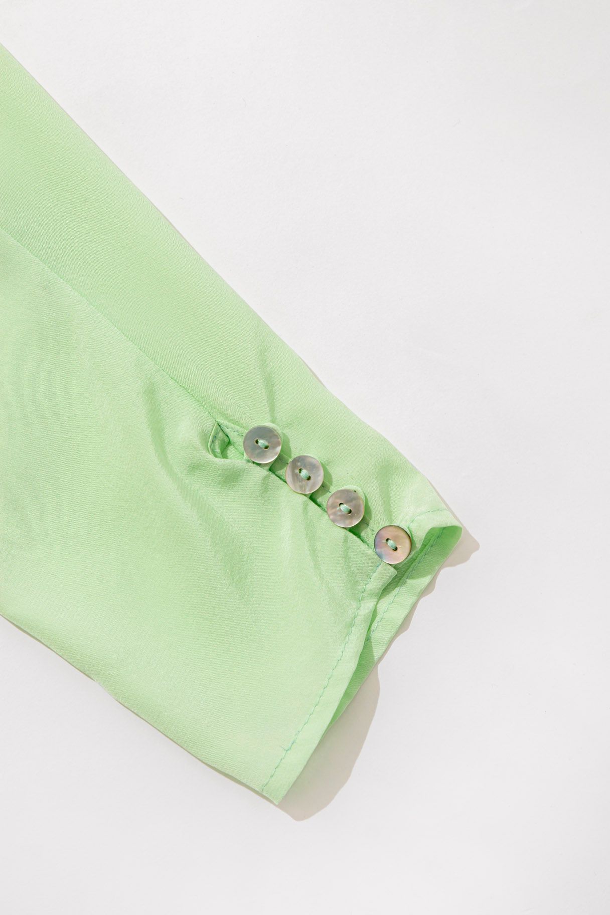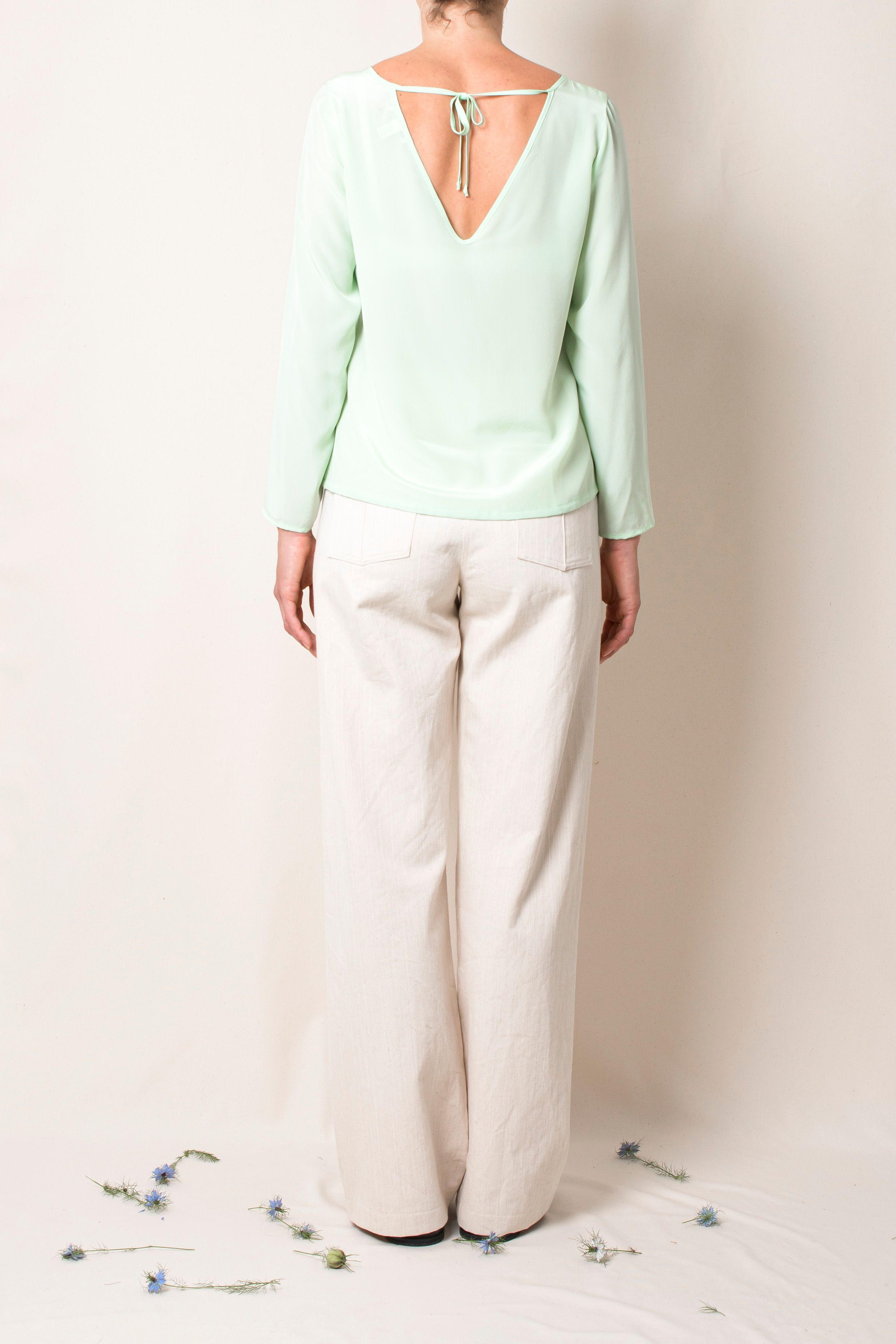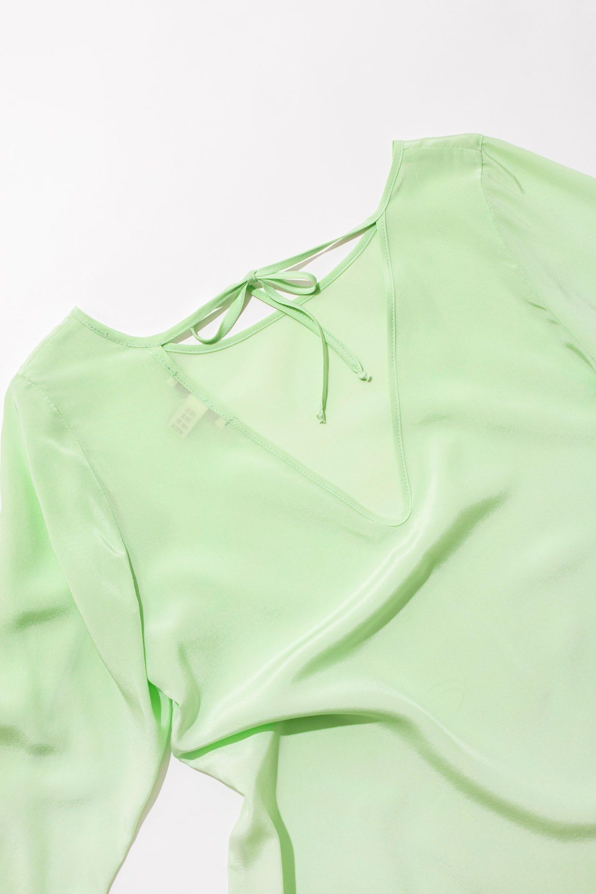 V-back detail with a tie across shoulders Sleeves finish below the elbow Button details on the sleeve Hem falls to the hip