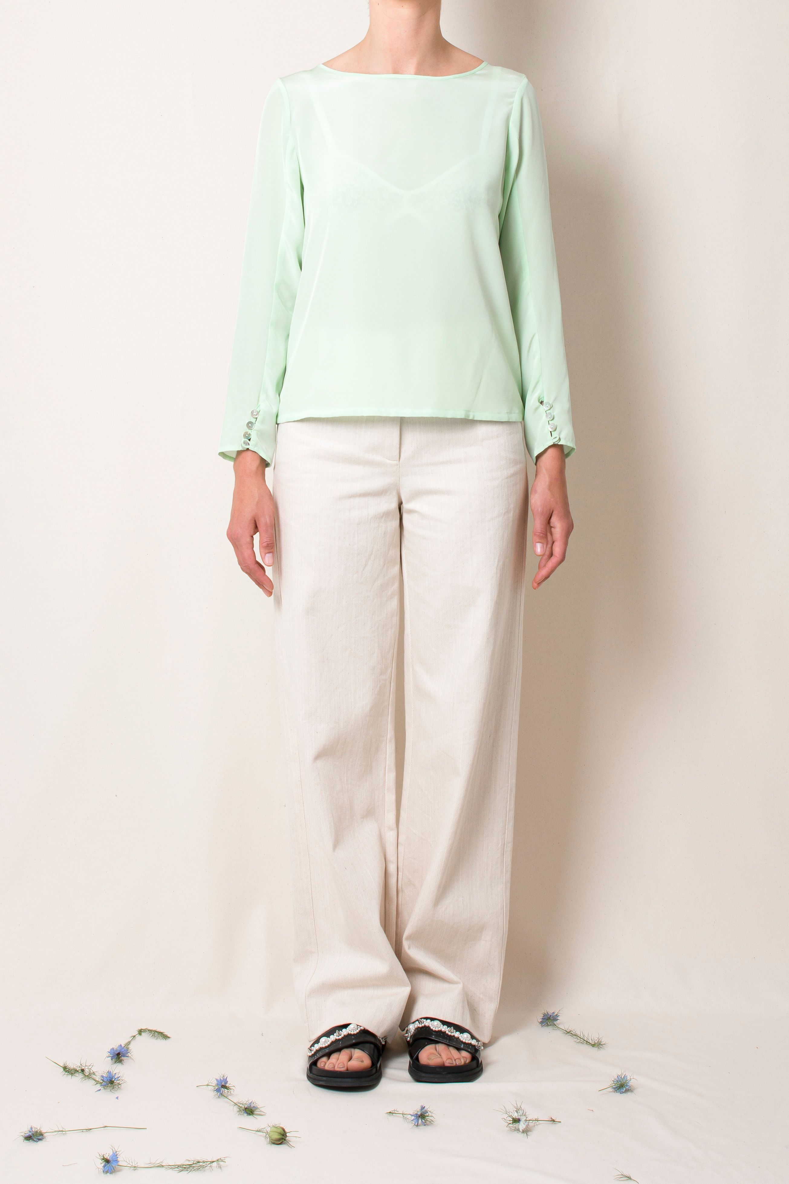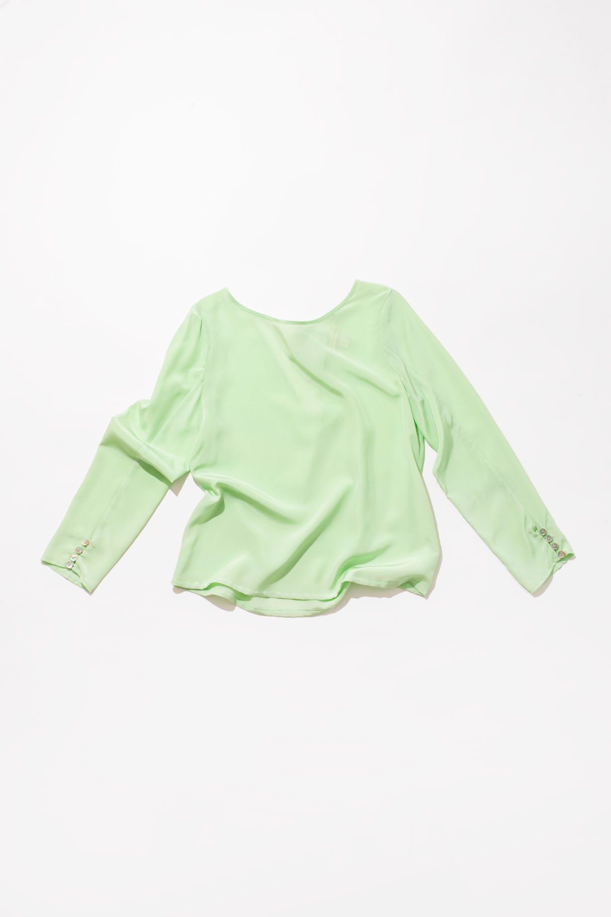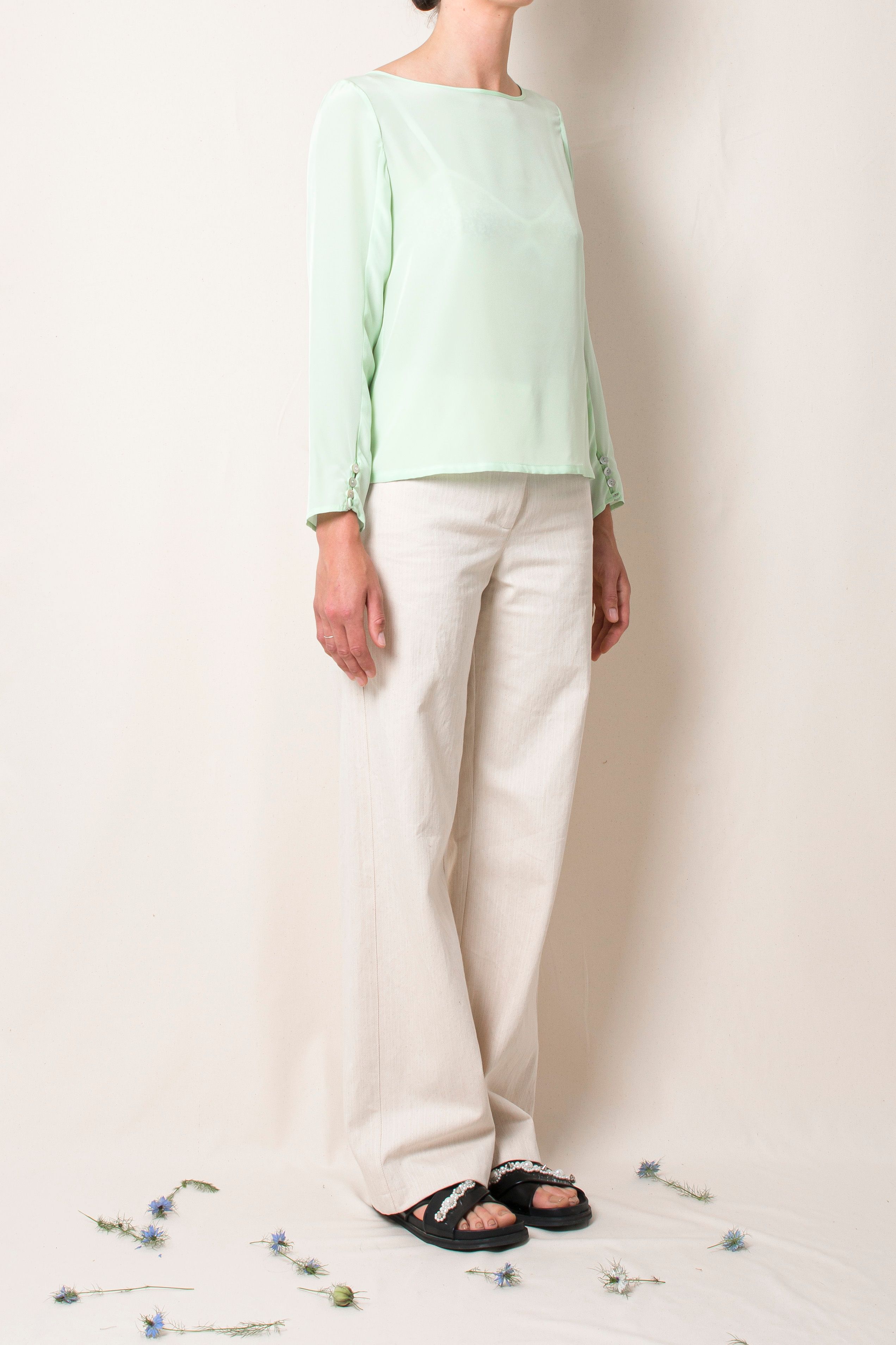 V-back detail with a tie across shoulders Sleeves finish below the elbow Button details on the sleeve Hem falls to the hip
