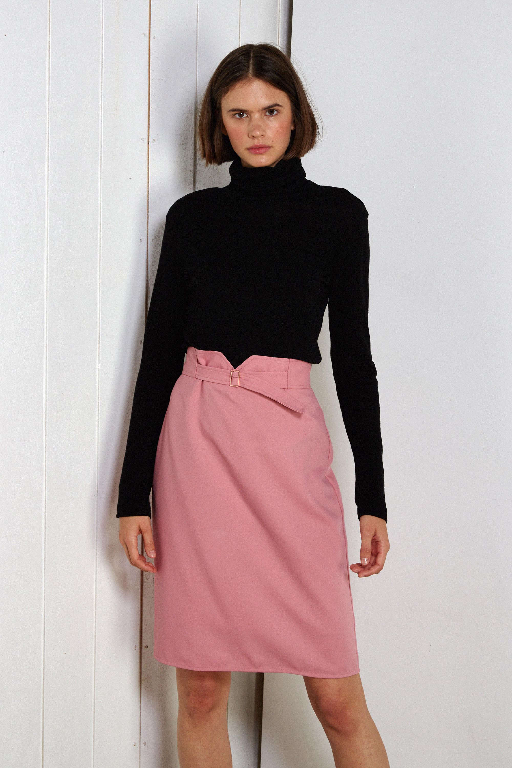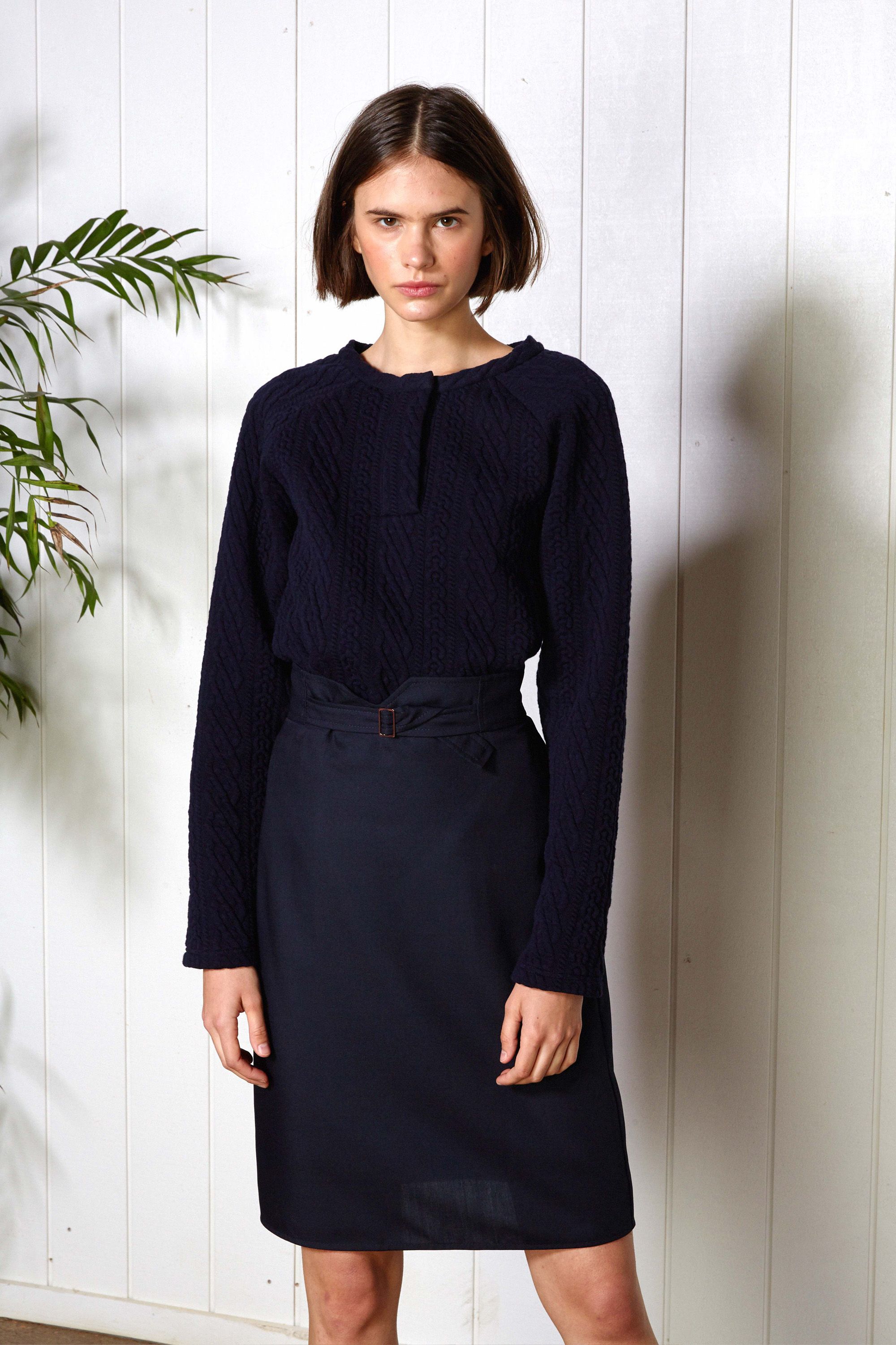 The Showater skirt is slick and pared back, perfect as winter workwear in a wool blend. Sitting high on the waist with a central half diamond cut out and attached belt detail. Smooth over the hips. Straight cut and finishes at the knee.
