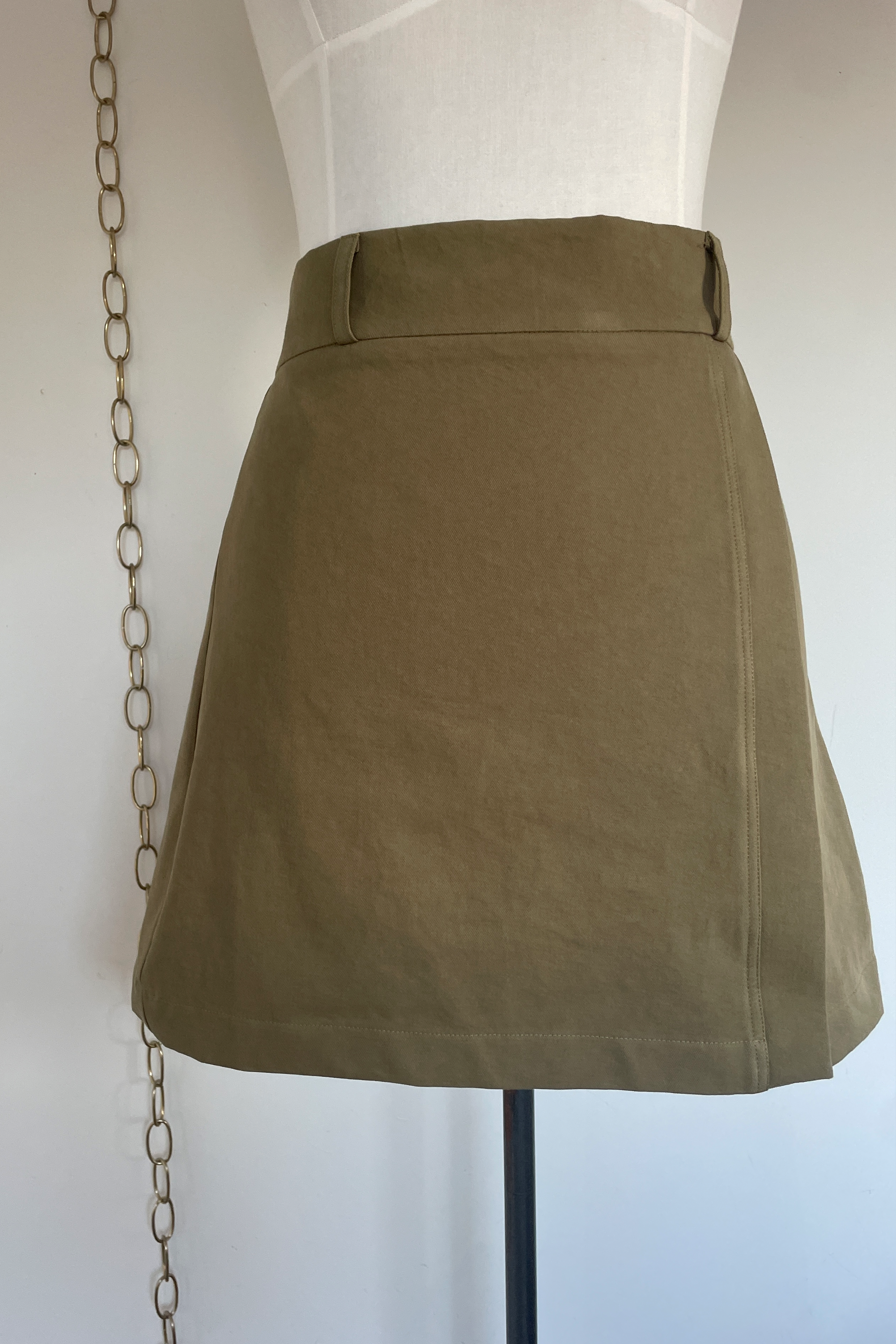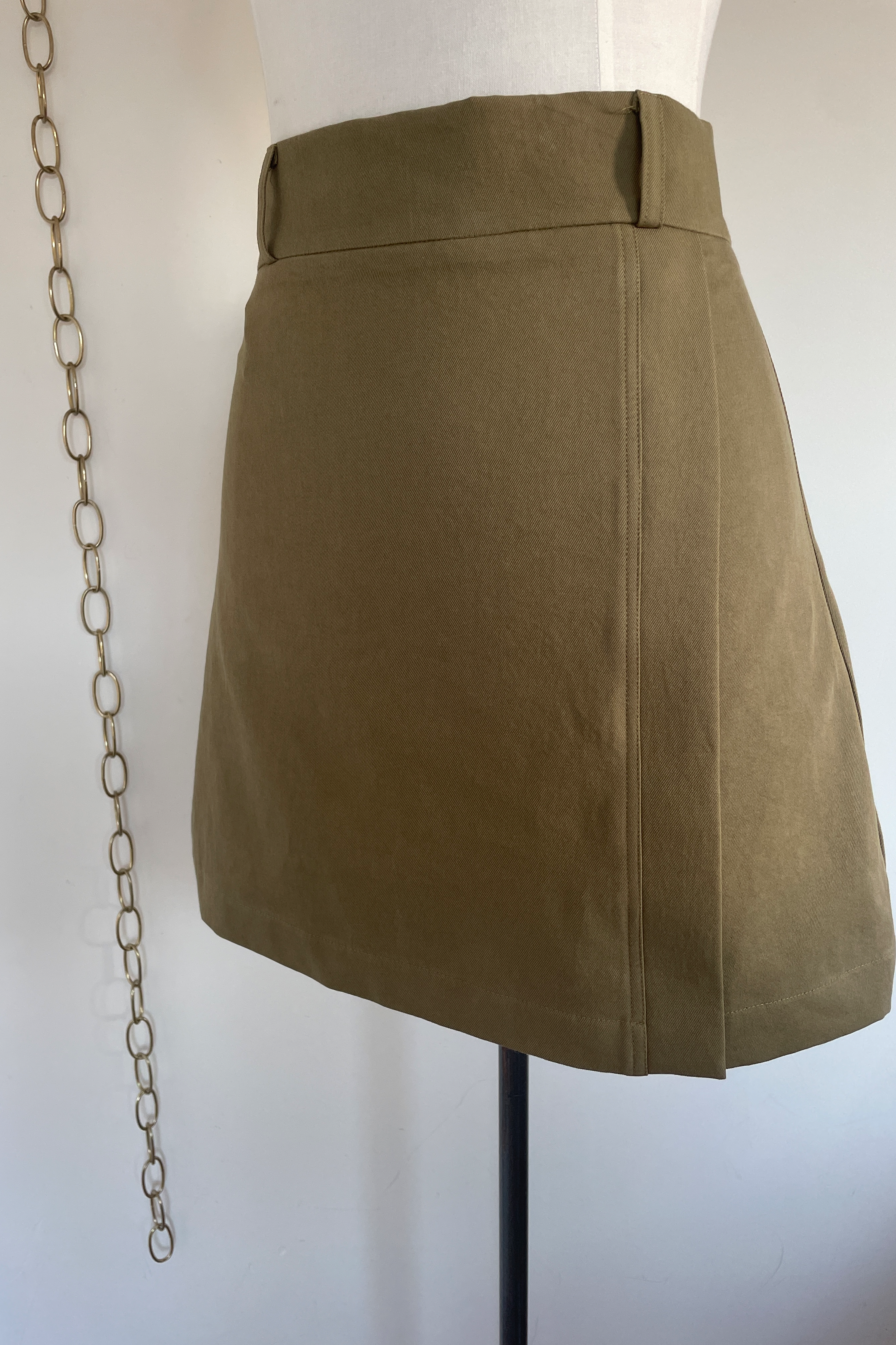The Sloan mini skirt in a beautiful soft cotton tencel blended drill, sits high on the waist and falls to the mid thigh. Fold detail runs asymmetrically down the front of skirt. Invisible zip through center back.