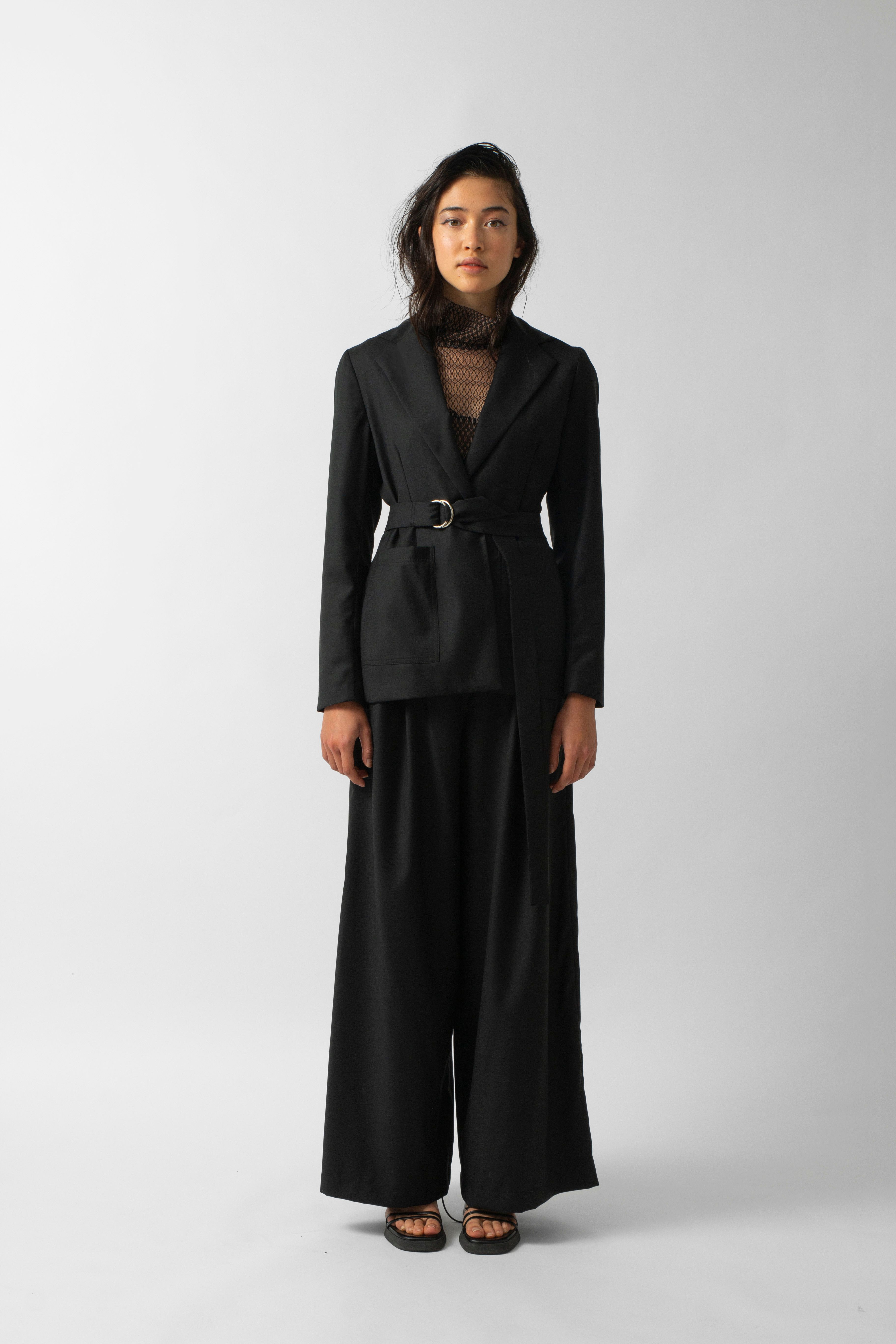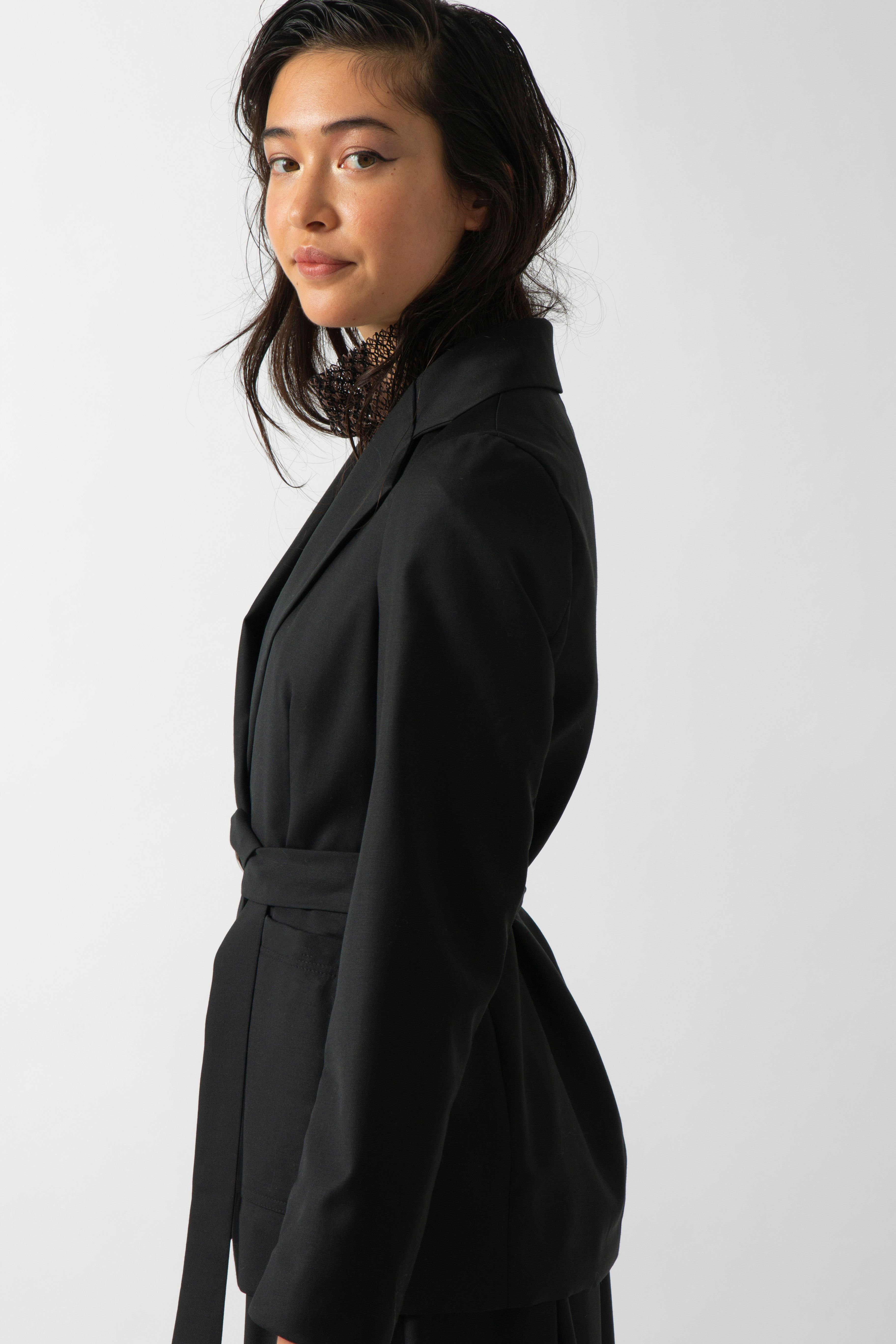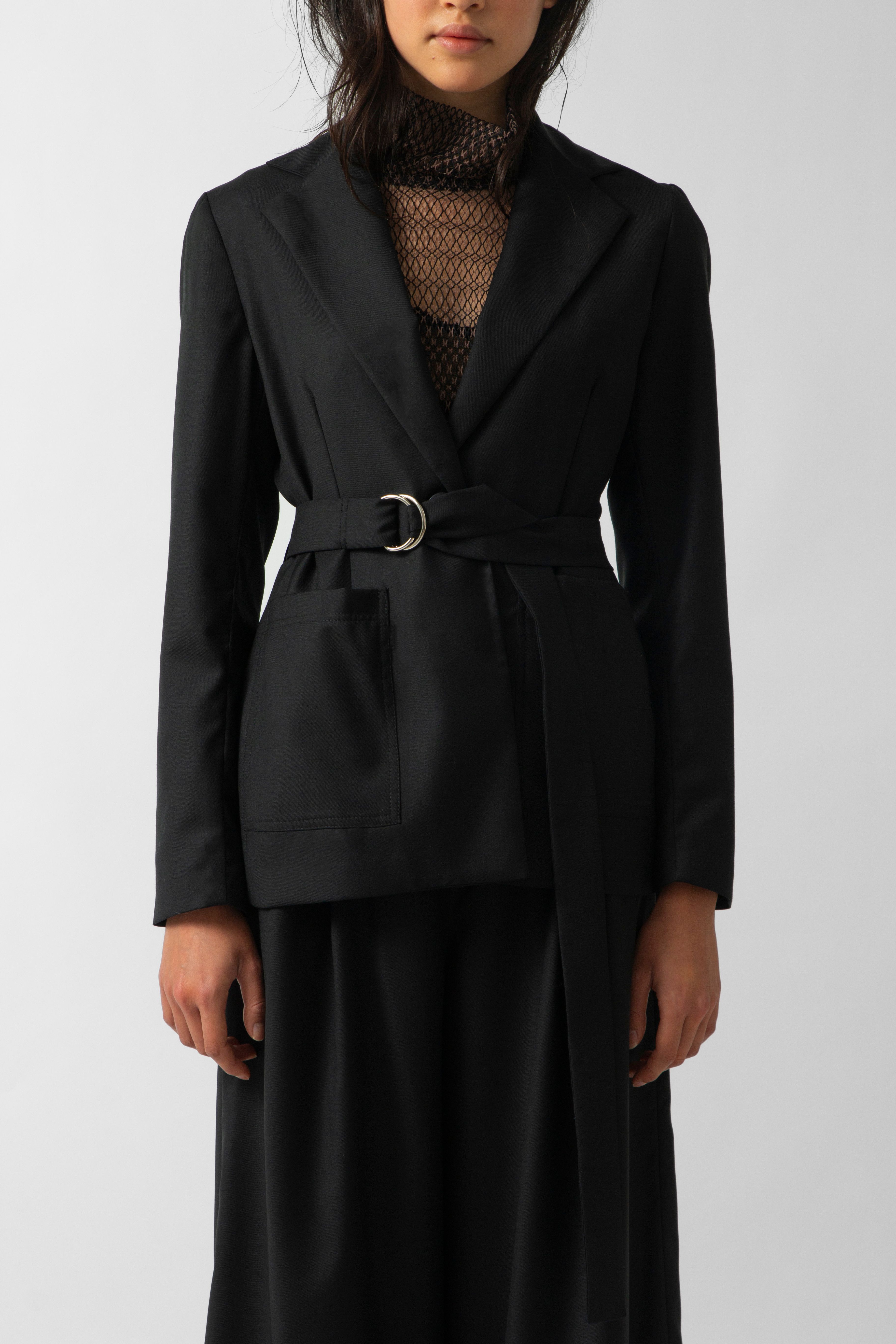 The Sloan Jacket features an elegant subtle hour glass silhoutte. Fits cleanly on the shoulder, front pockets and a Silver D Ring belt that sits on the natural waistline.