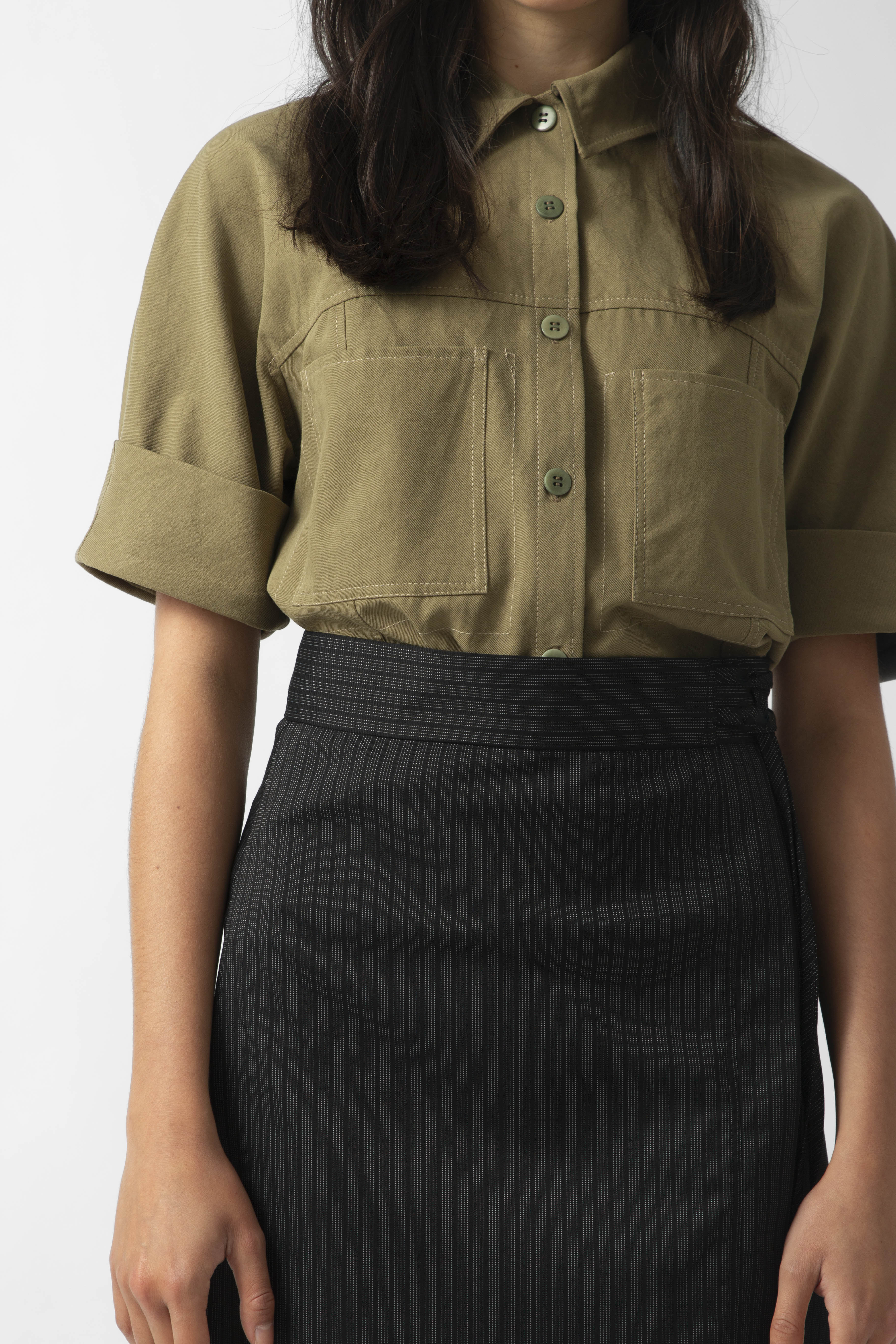The Sloan mini skirt sits high on the waist and falls to the mid thigh. Fold detail runs asymmetrically down the front of skirt. Invisible zip through center back.