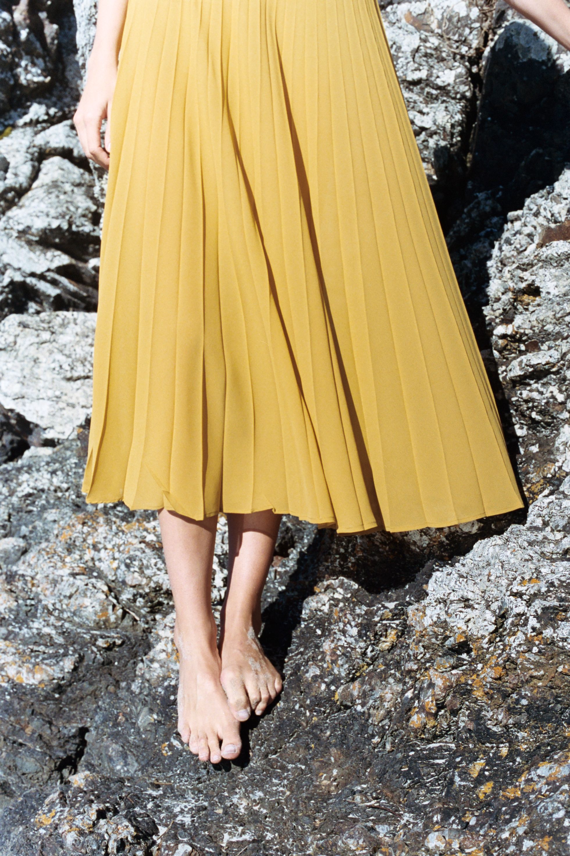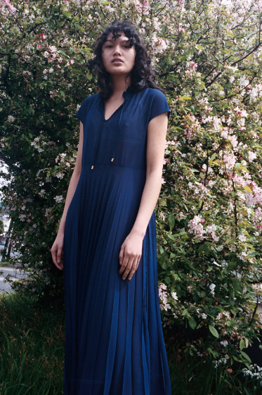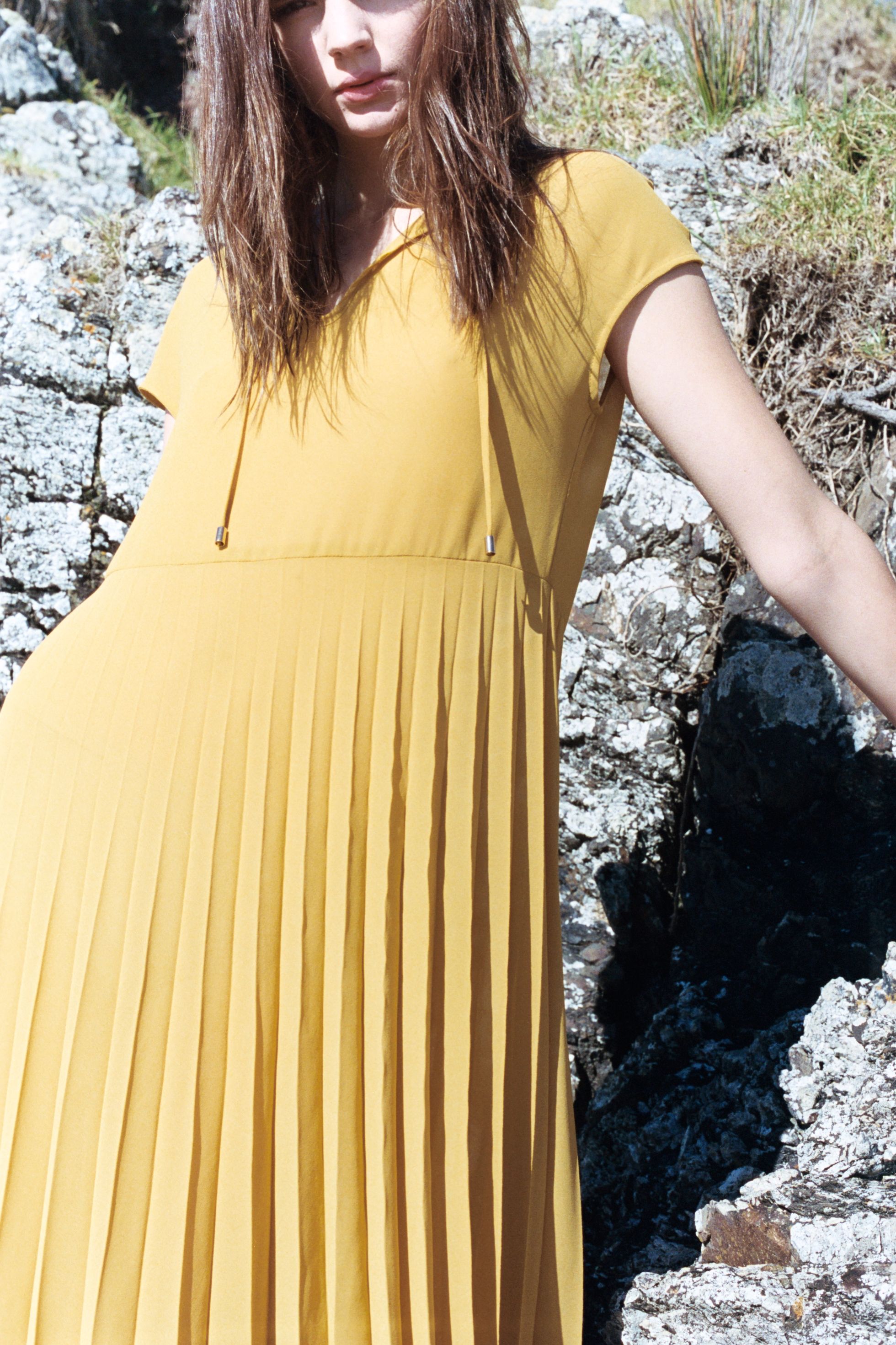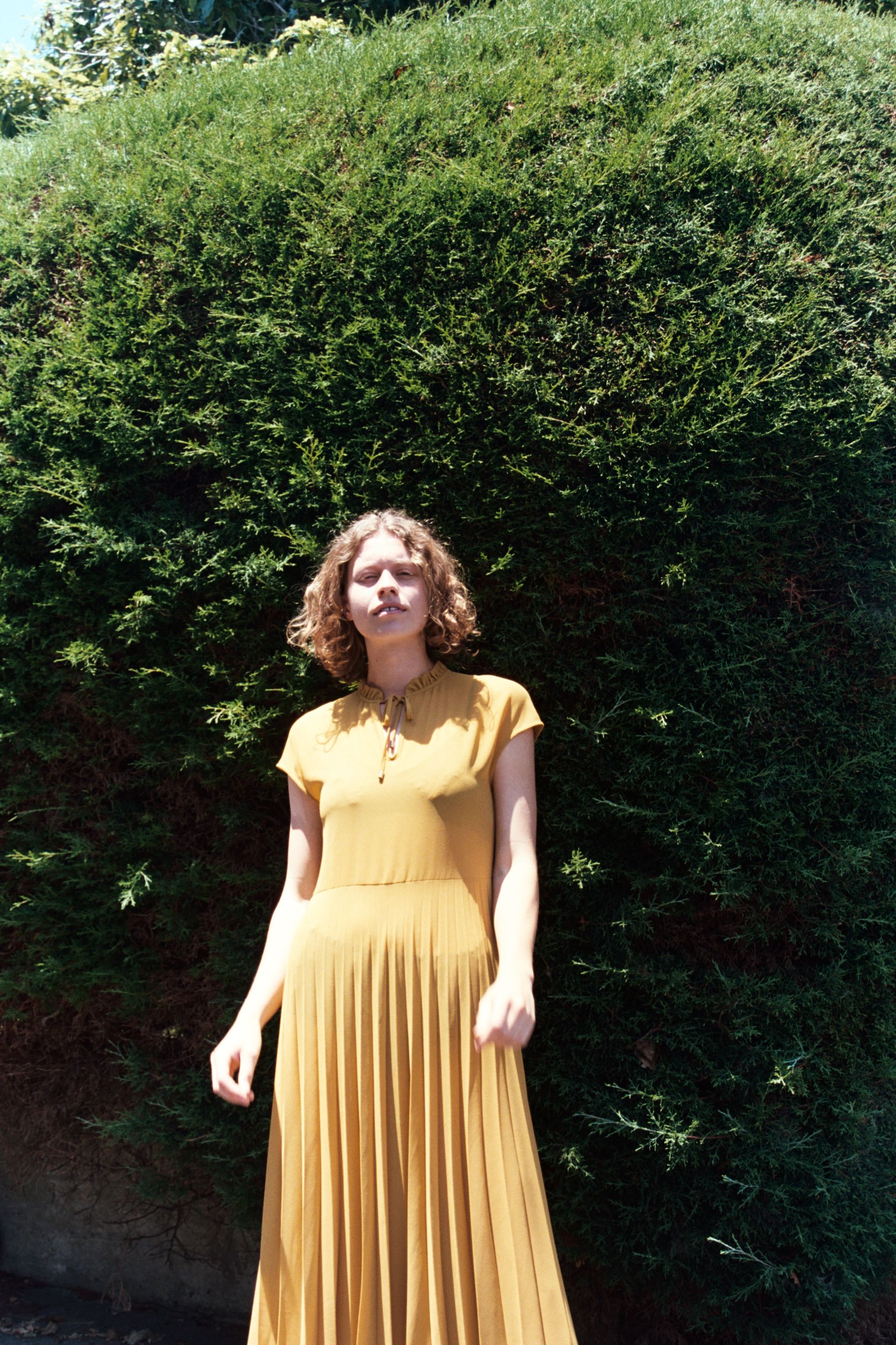 A soft sun-ray pleated dress featuring a delicate, softly gathered collar that sits on the neck and ties to close leaving a keyhole detail. Cap sleeves hug the top of the shoulder. Falls to mid calf.