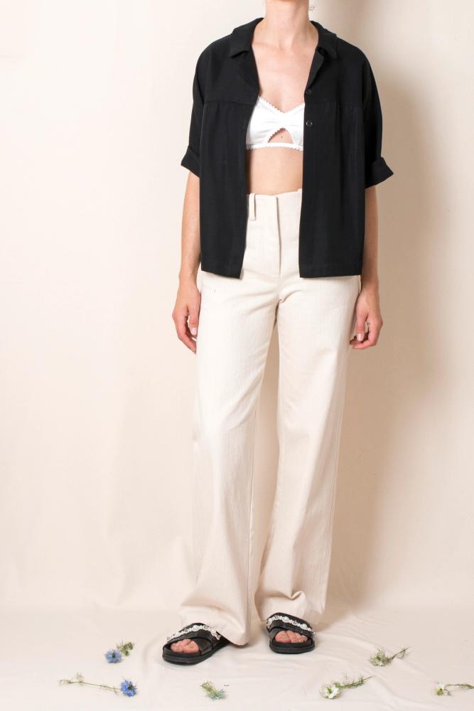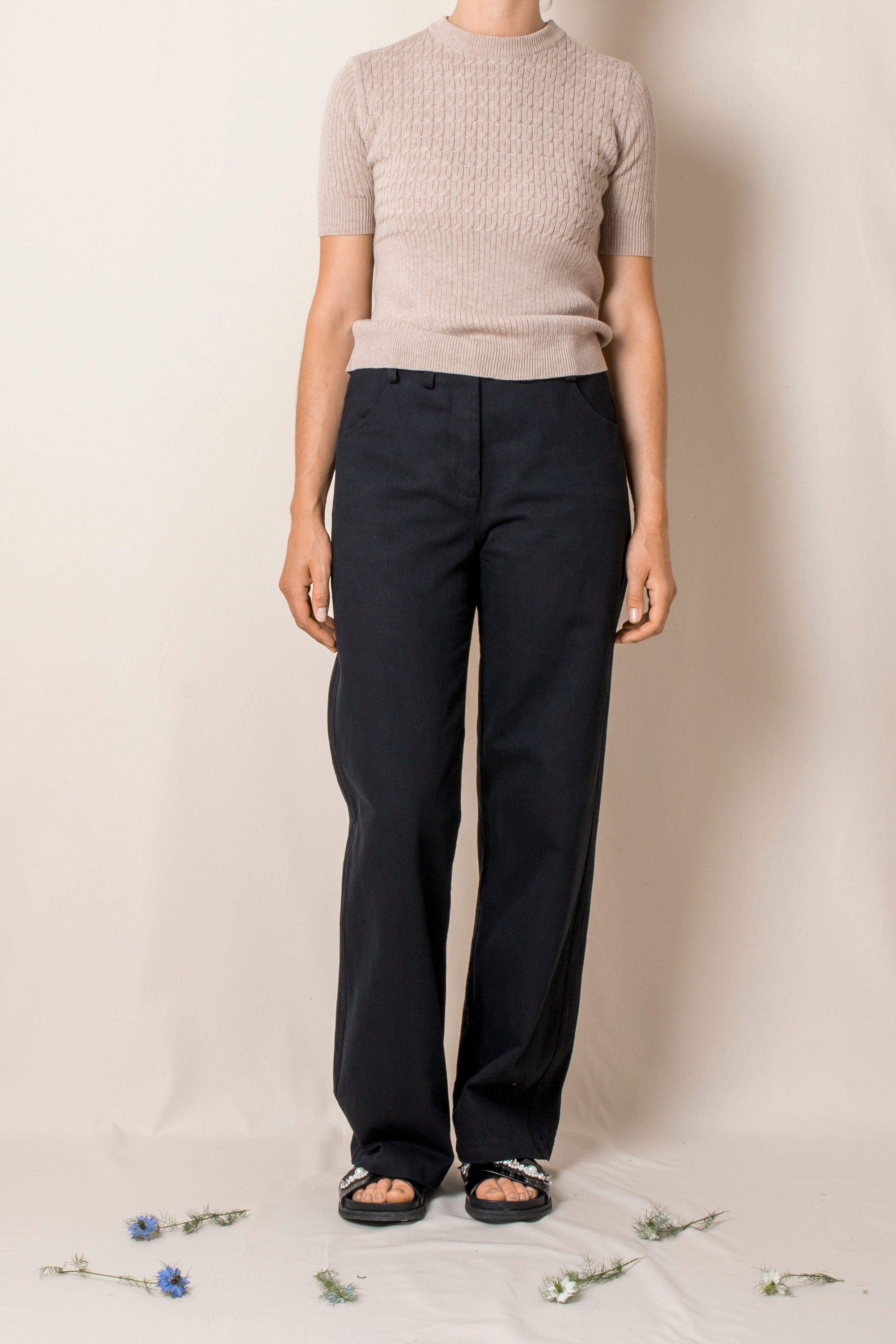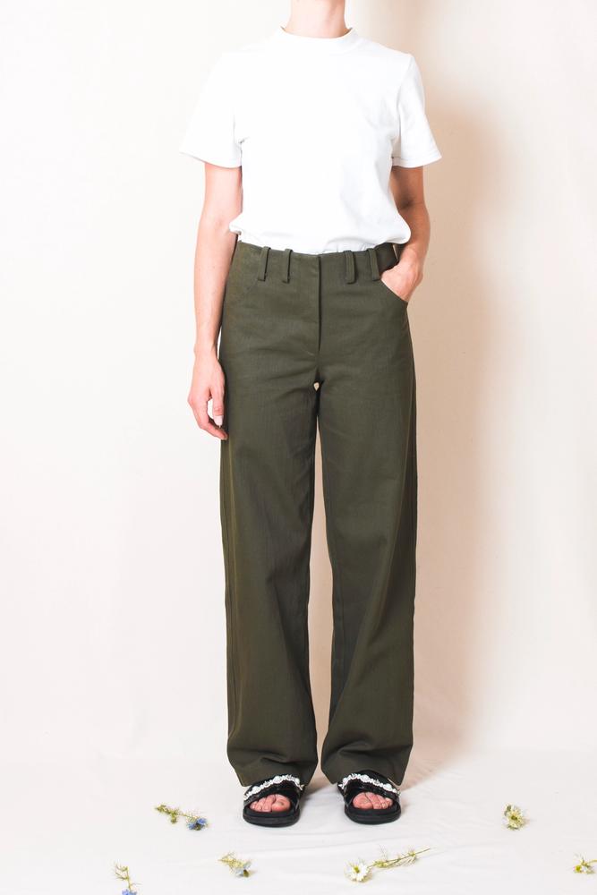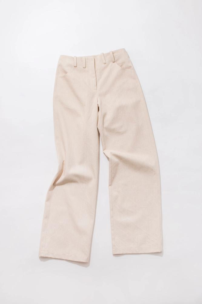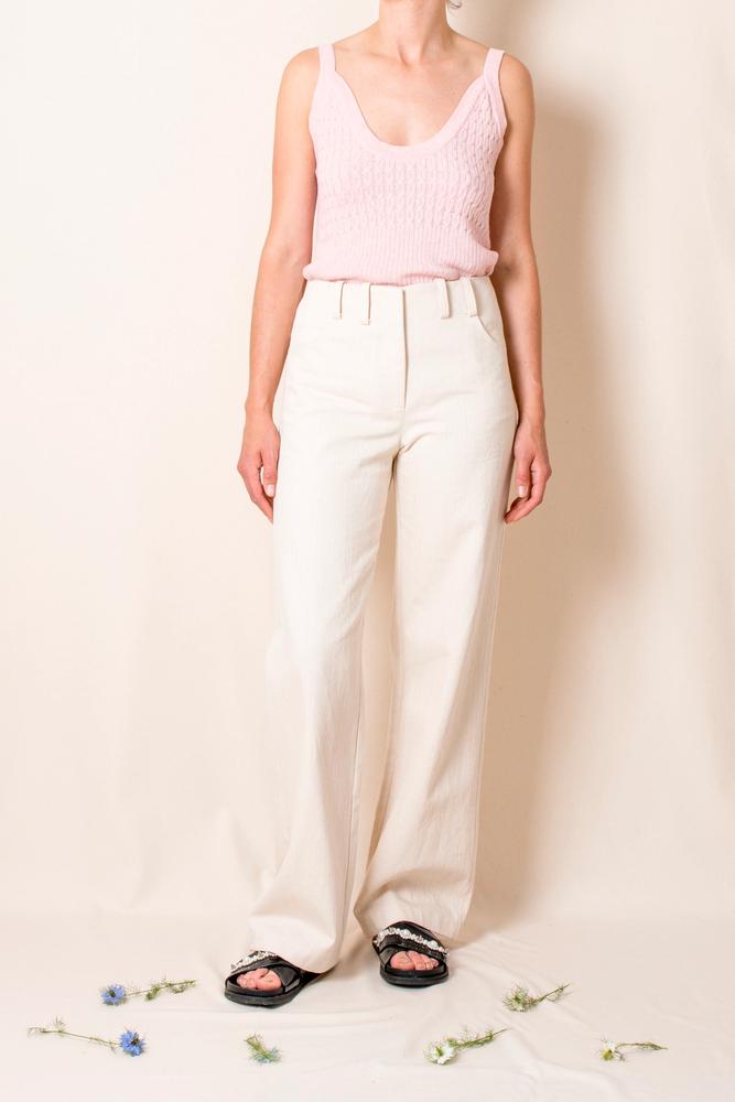 Highwaist, zip closure Belt loops Pockets at hips Wide leg