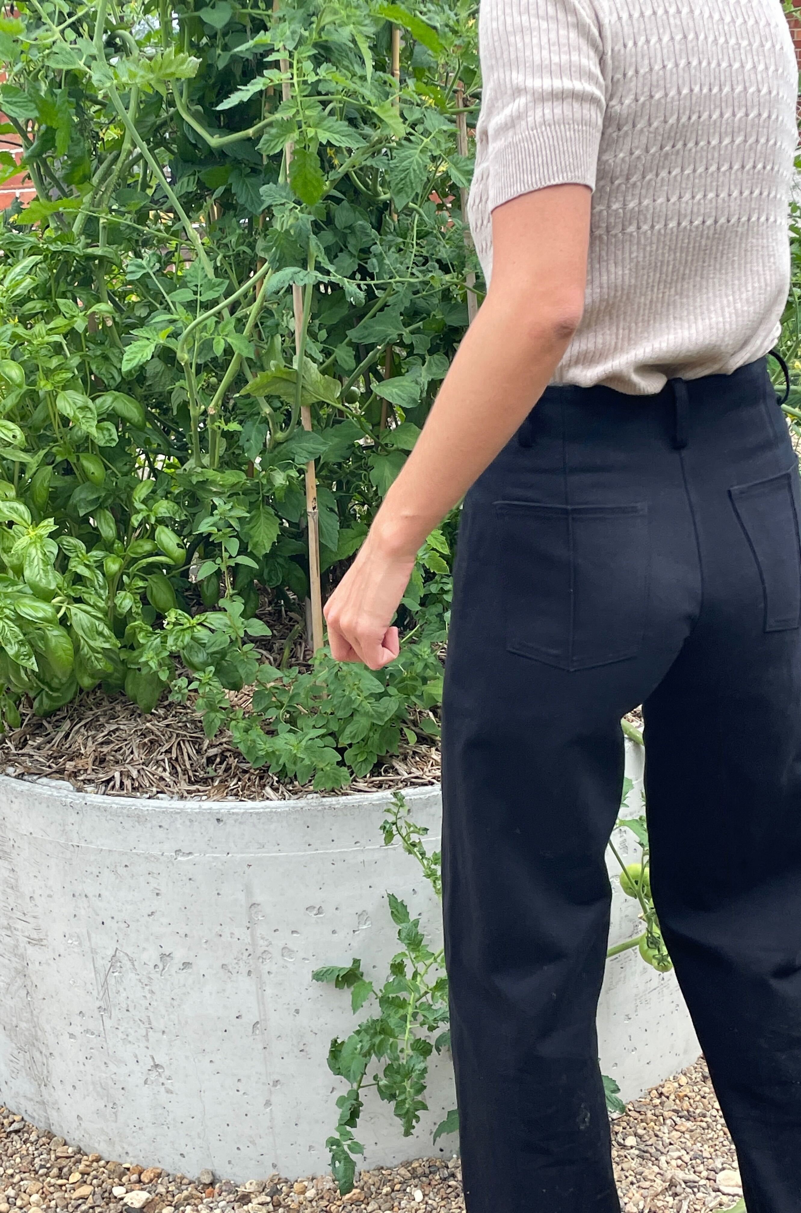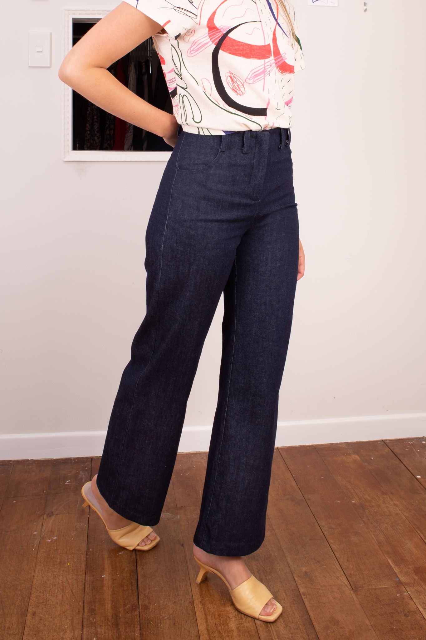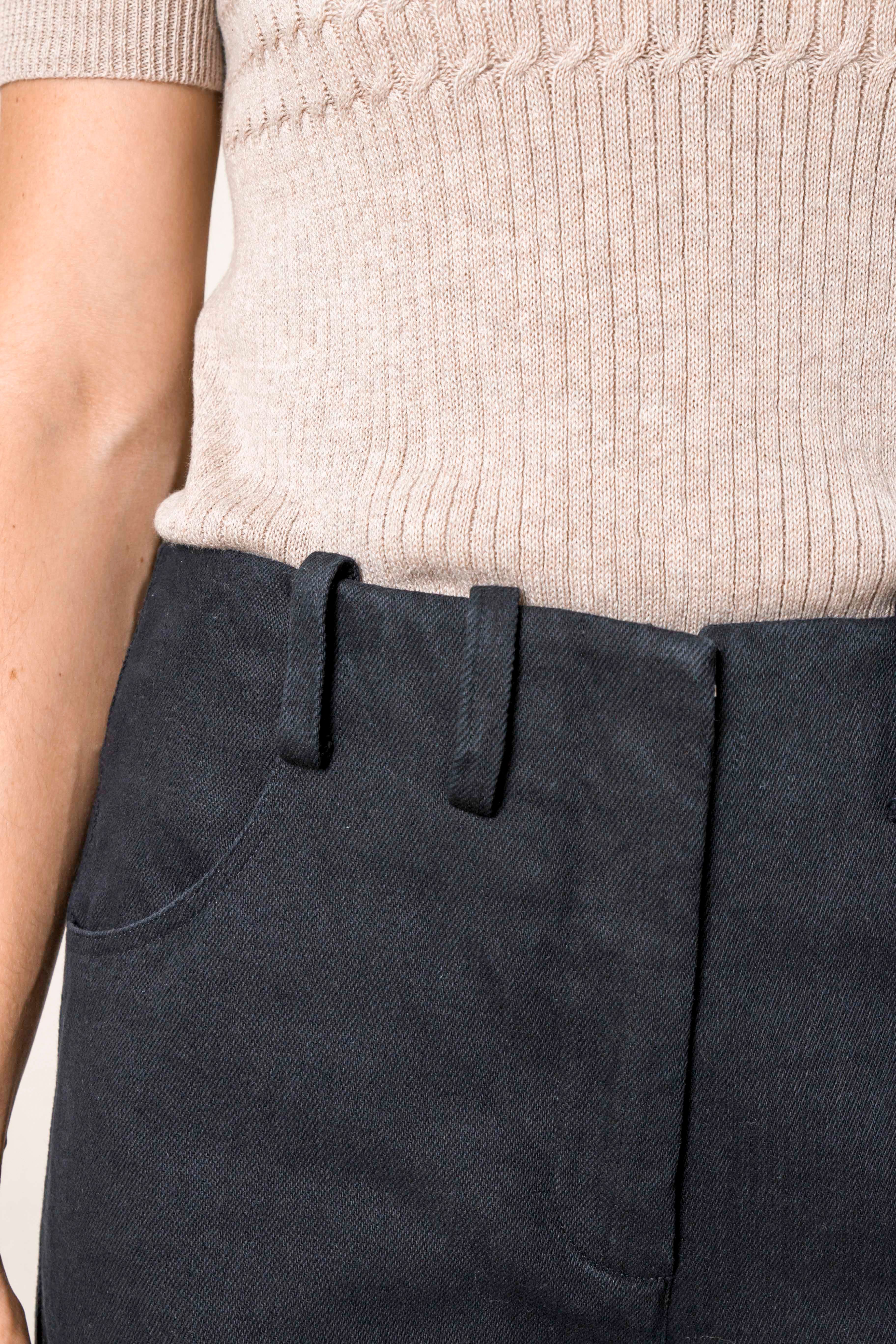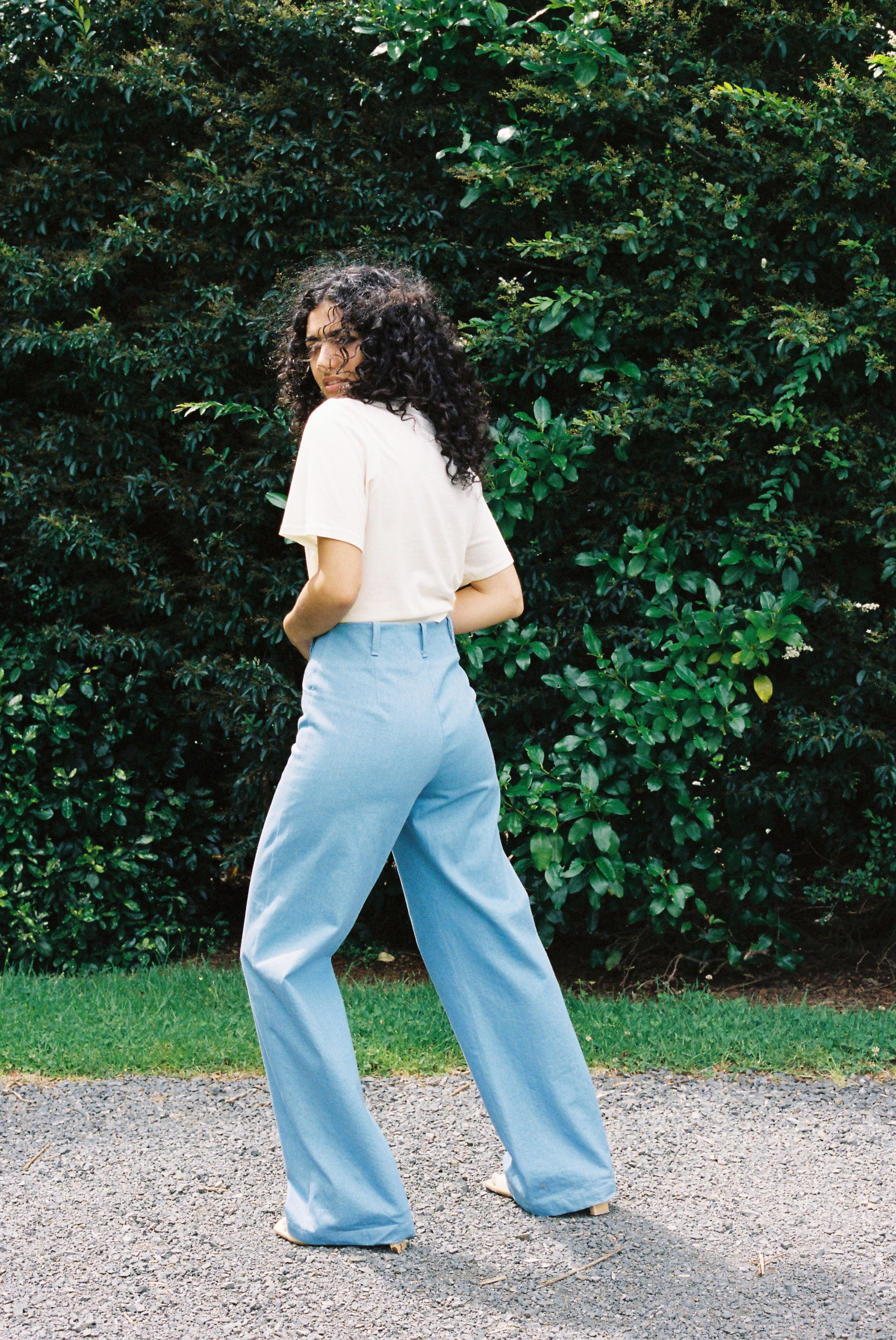 Highwaist, zip closure Belt loops Pockets at hips Wide leg