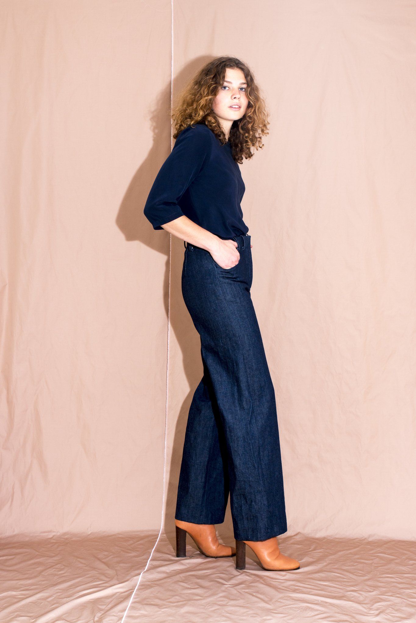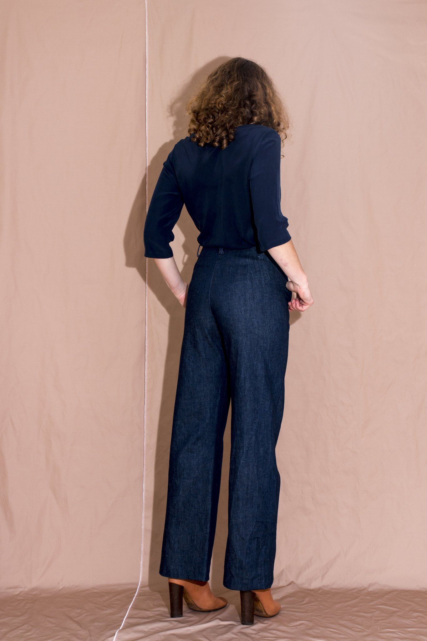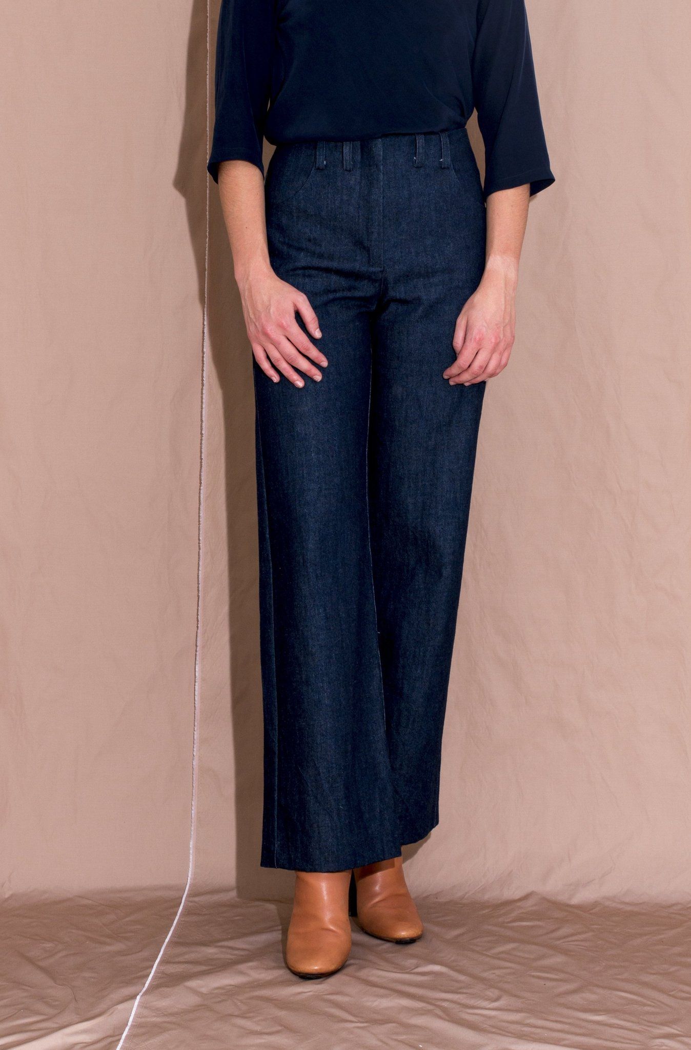 Highwaist, zip closure Pockets at hips Slim over waist and hips, straight down the leg