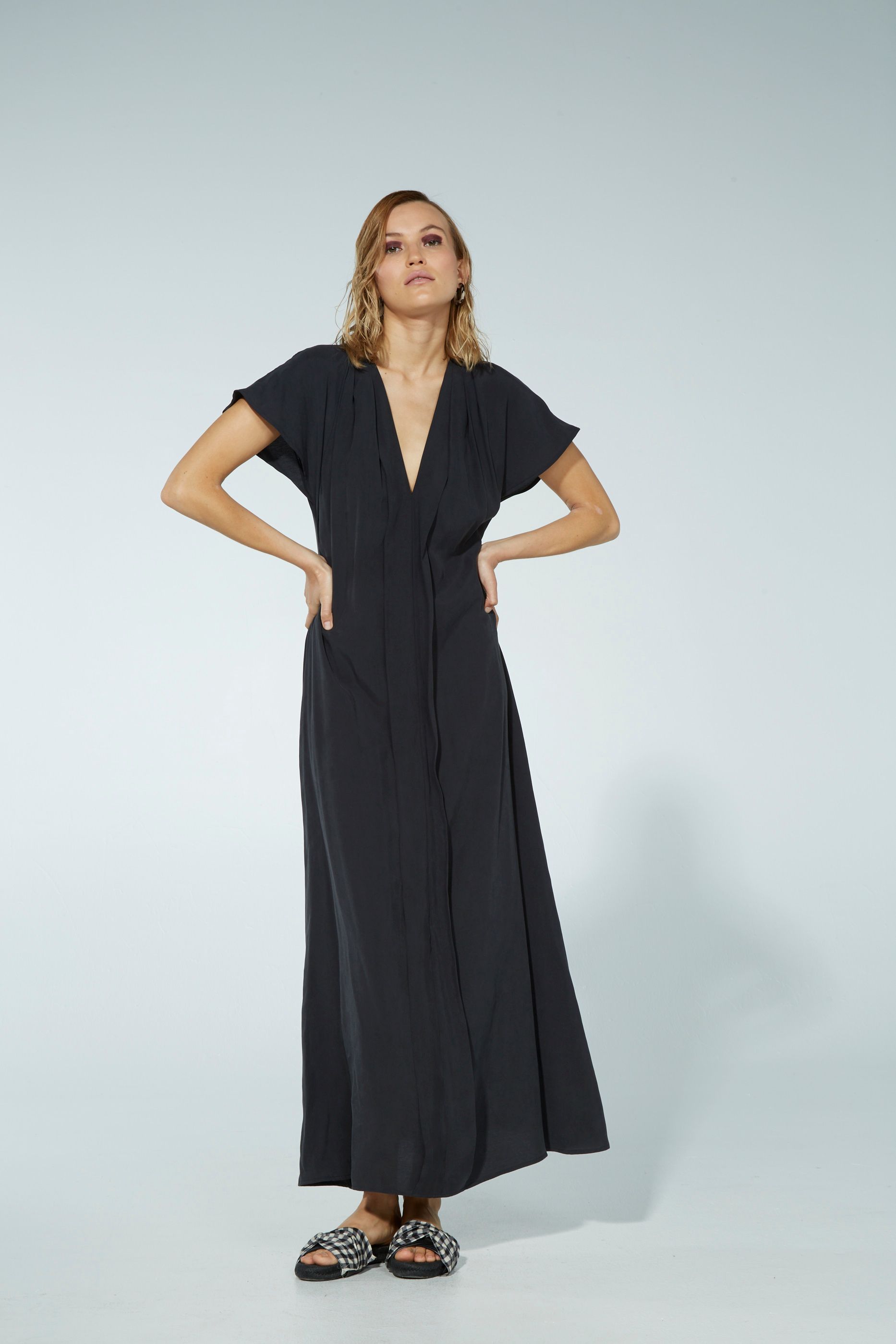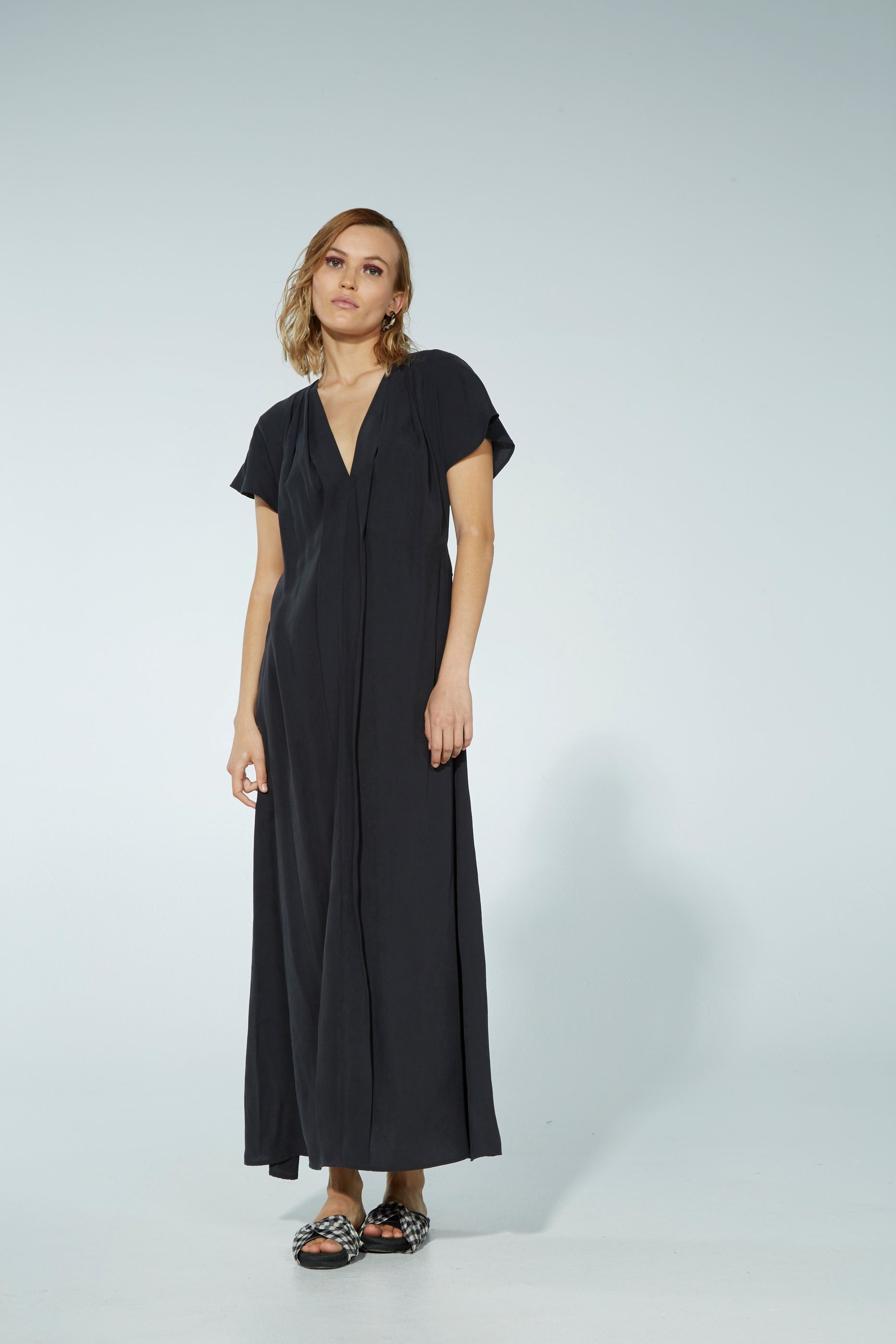 The Tullia dress a relaxed and elegant style. The Tulia dress is soft on the shoulder with a short, subtle bell sleeve. V neck leads to fold over detail that runs to the hem.
