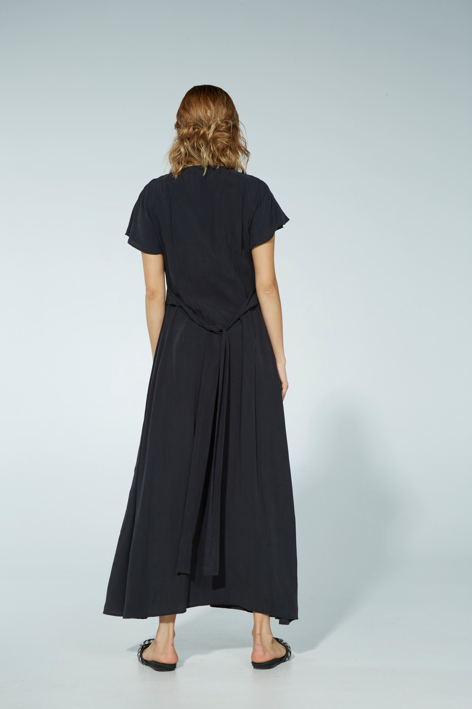 Cut beautifully, the fabric drapes over the body and can be tied with a waist tie.