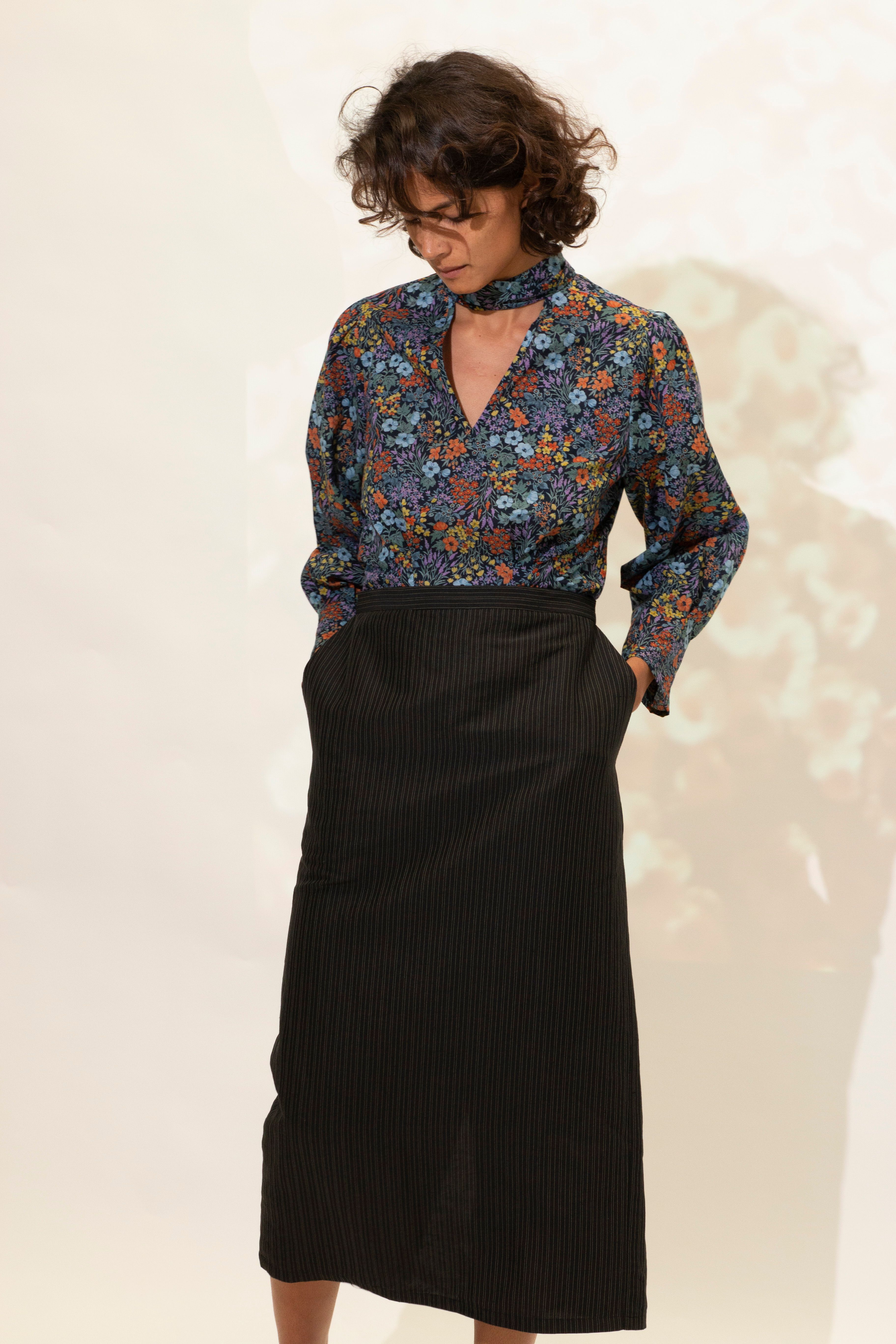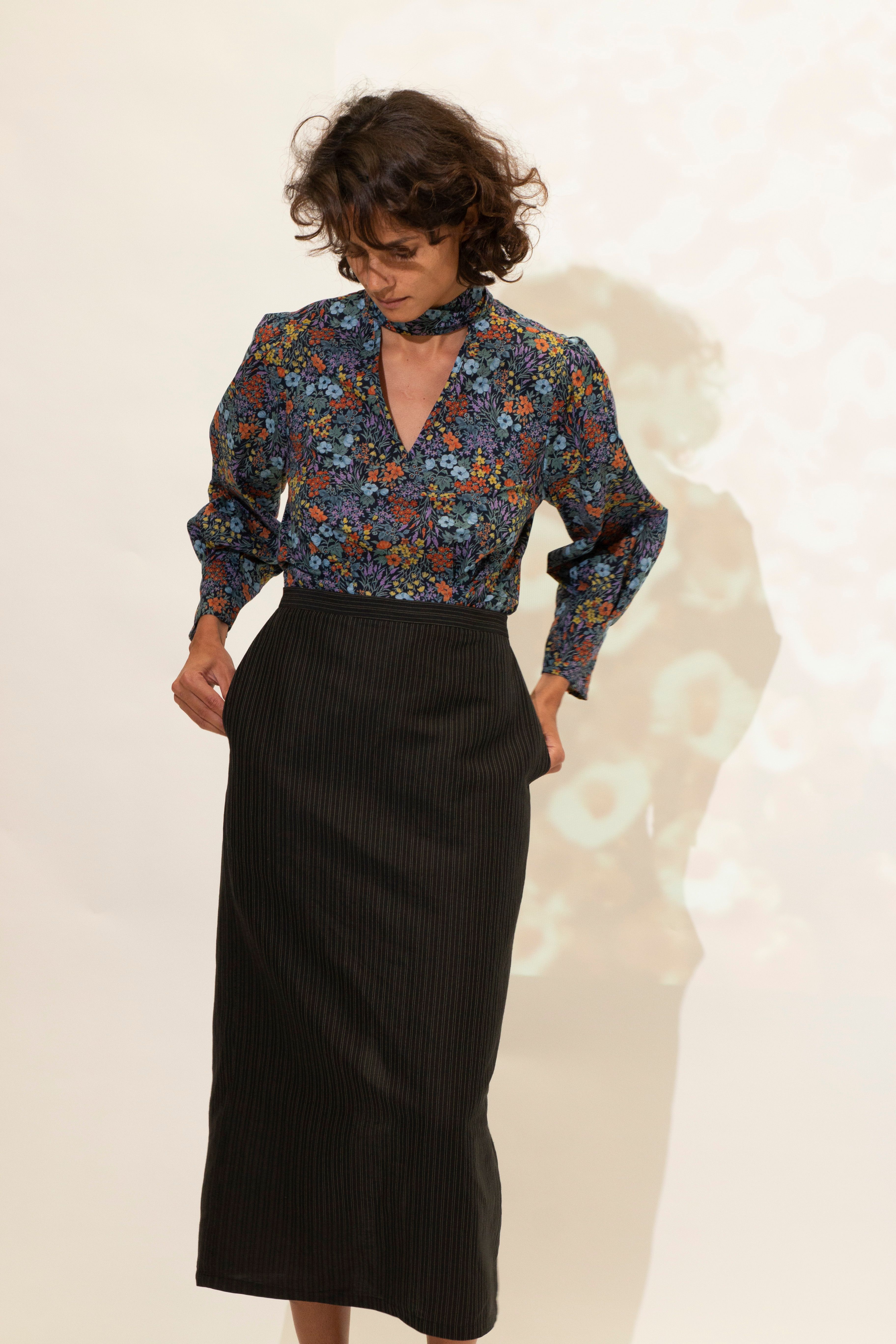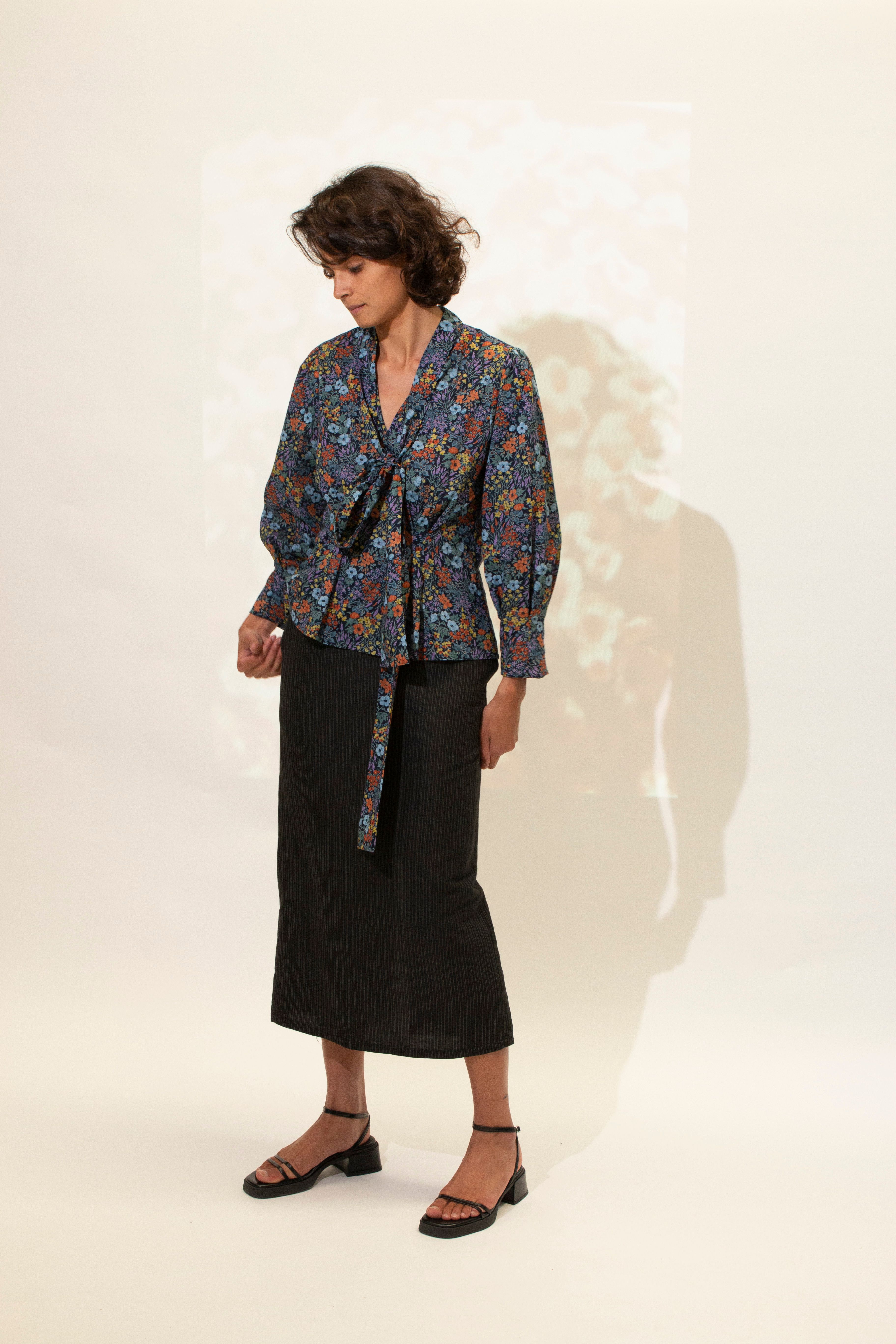 Double tucks at front of the body Hem finishes at the hip V-neck with tie Folded tuck detail on sleeve Made in Aotearoa