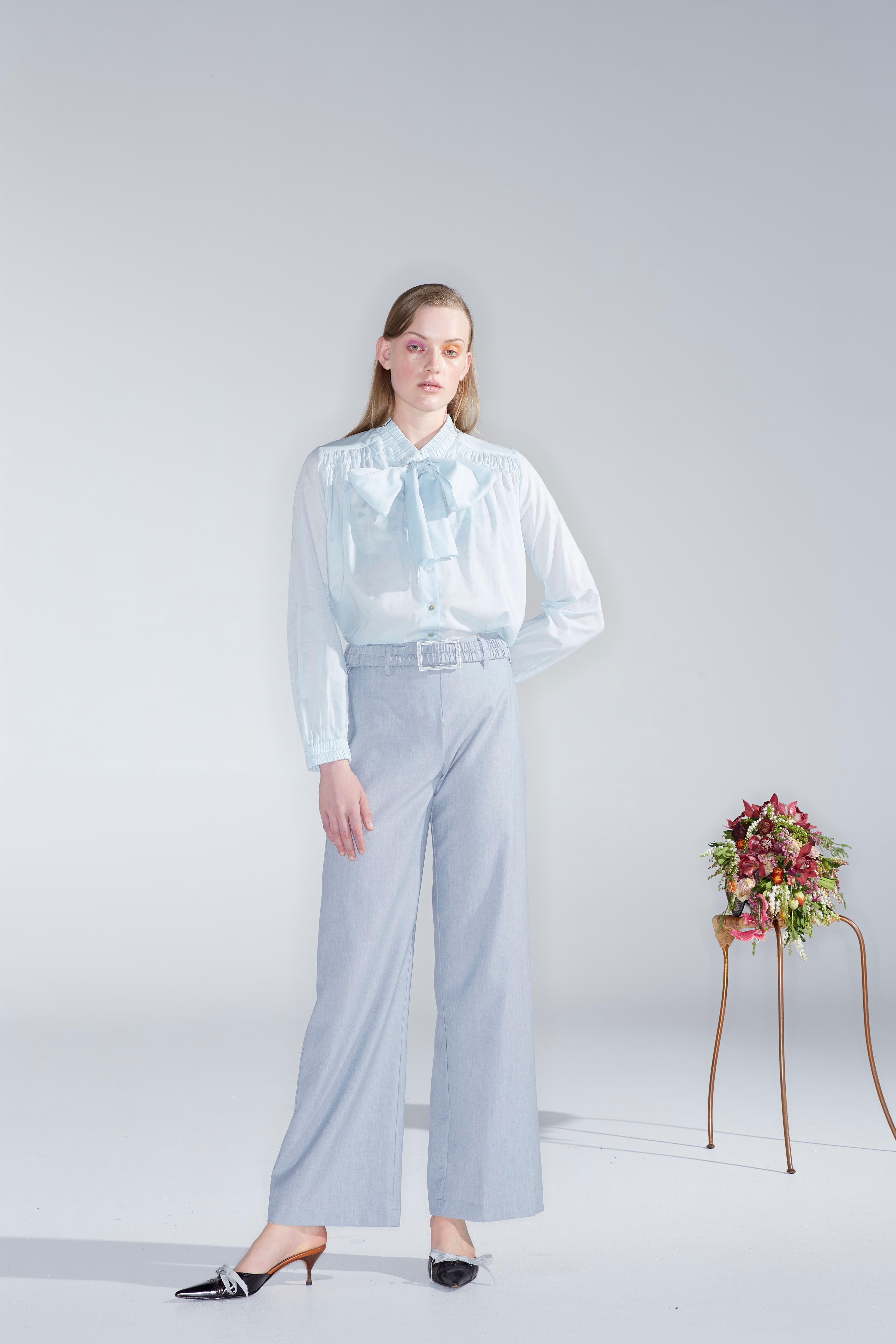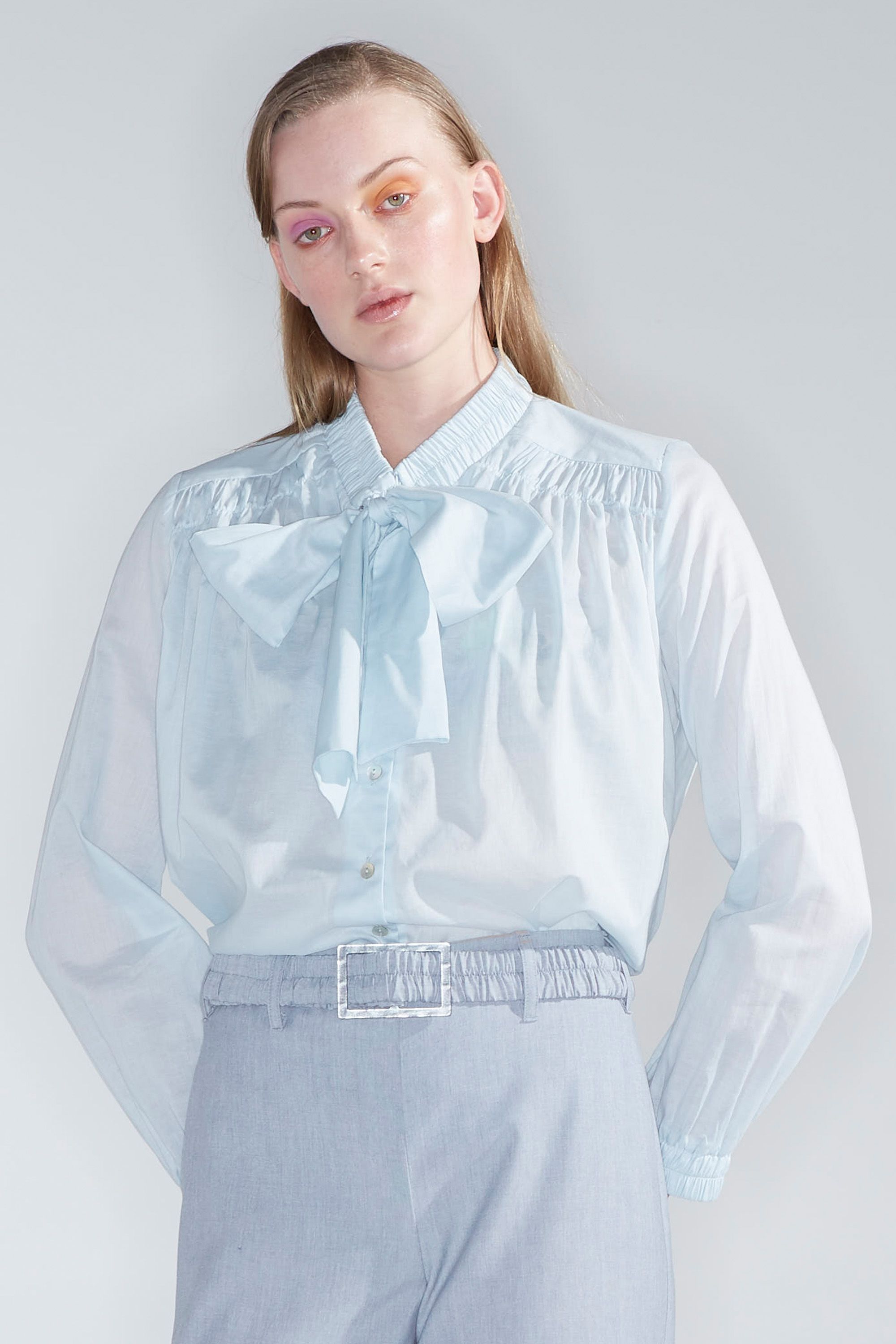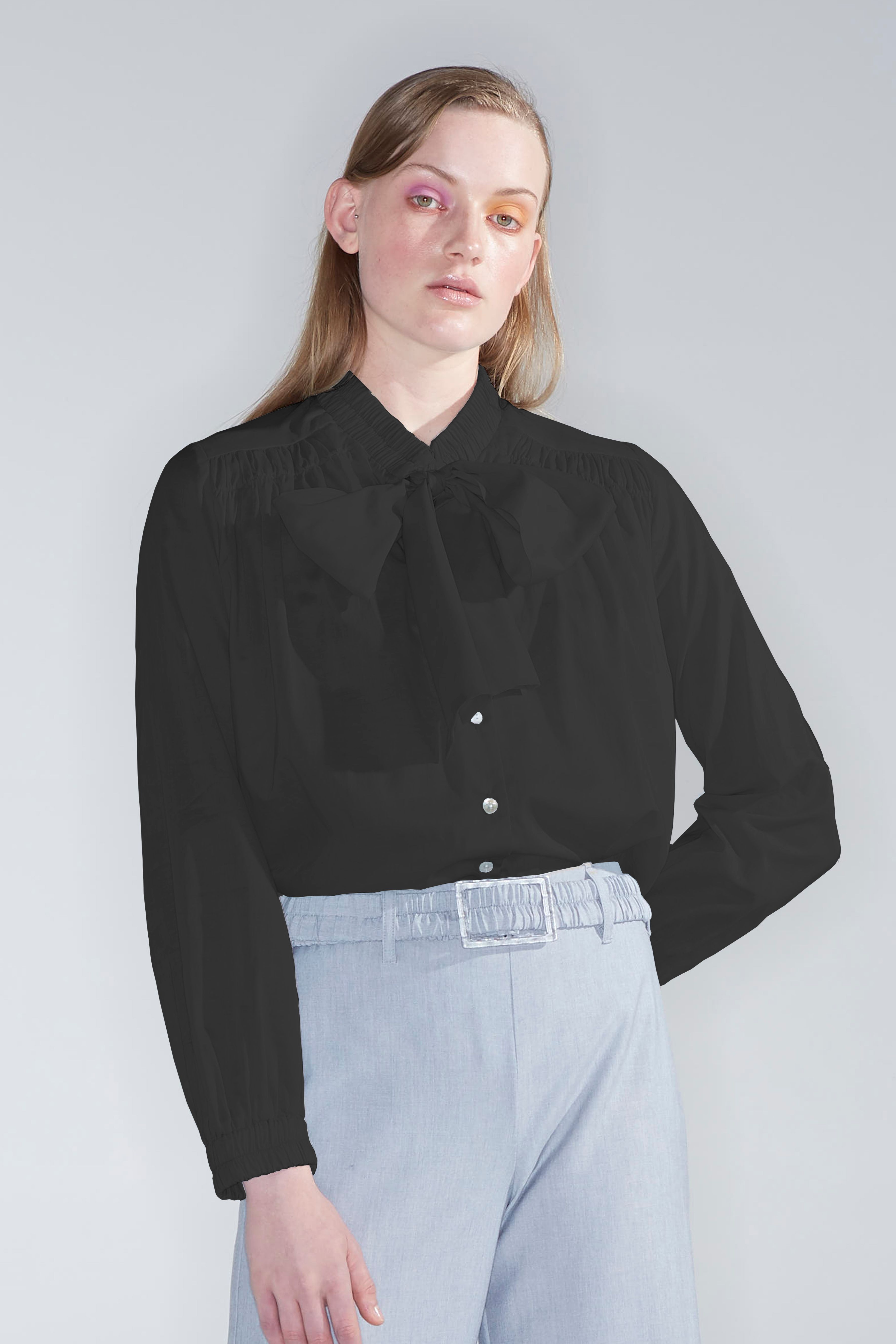 With pussy-bow at neckline followed by button-up fastening at the centre front. Full length lightly billowing sleeve with gather at cuff. Hem finishes at the hip. Relaxed fit in the body - wear out or tuck into a high-waisted pant or skirt.