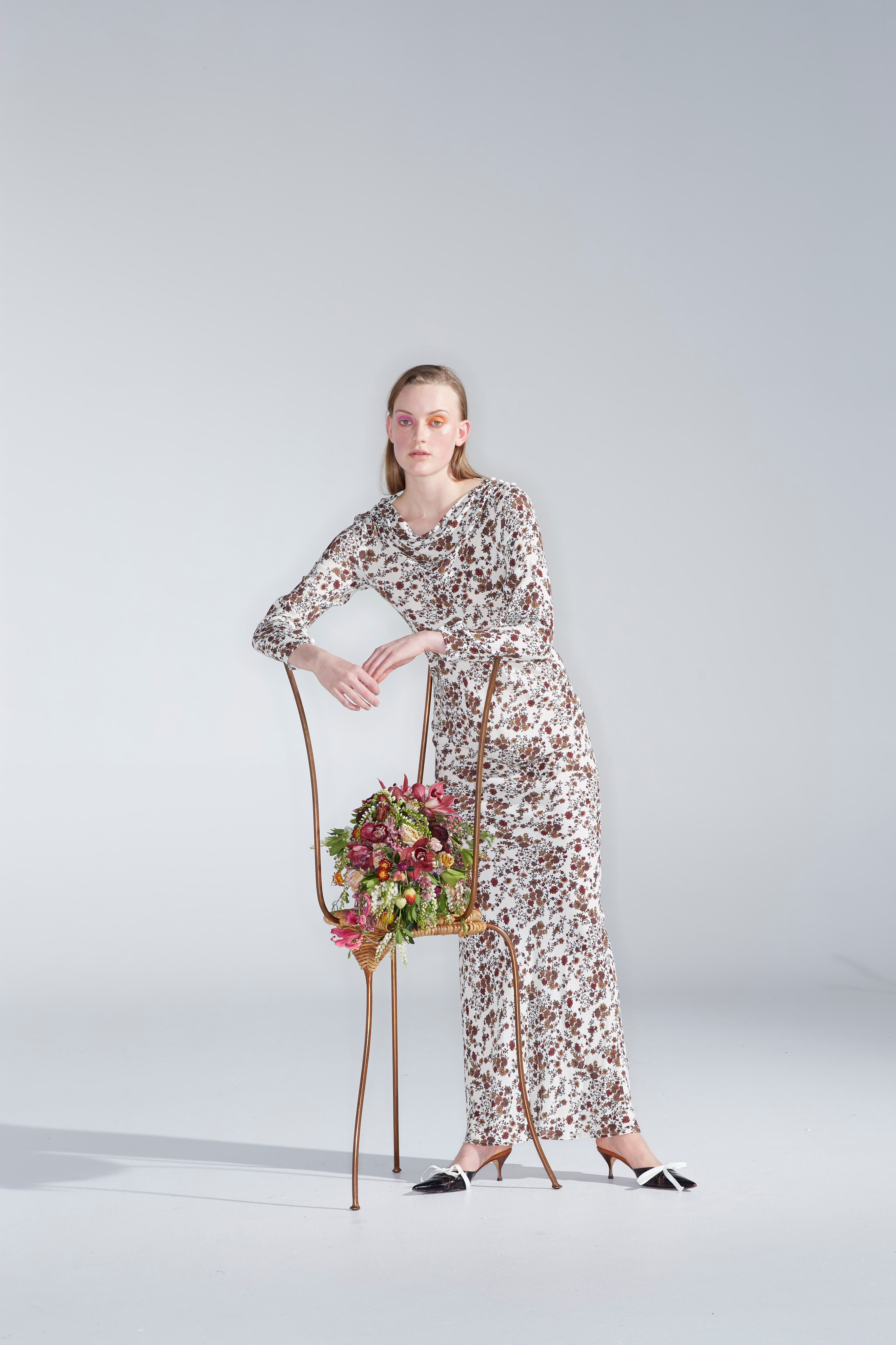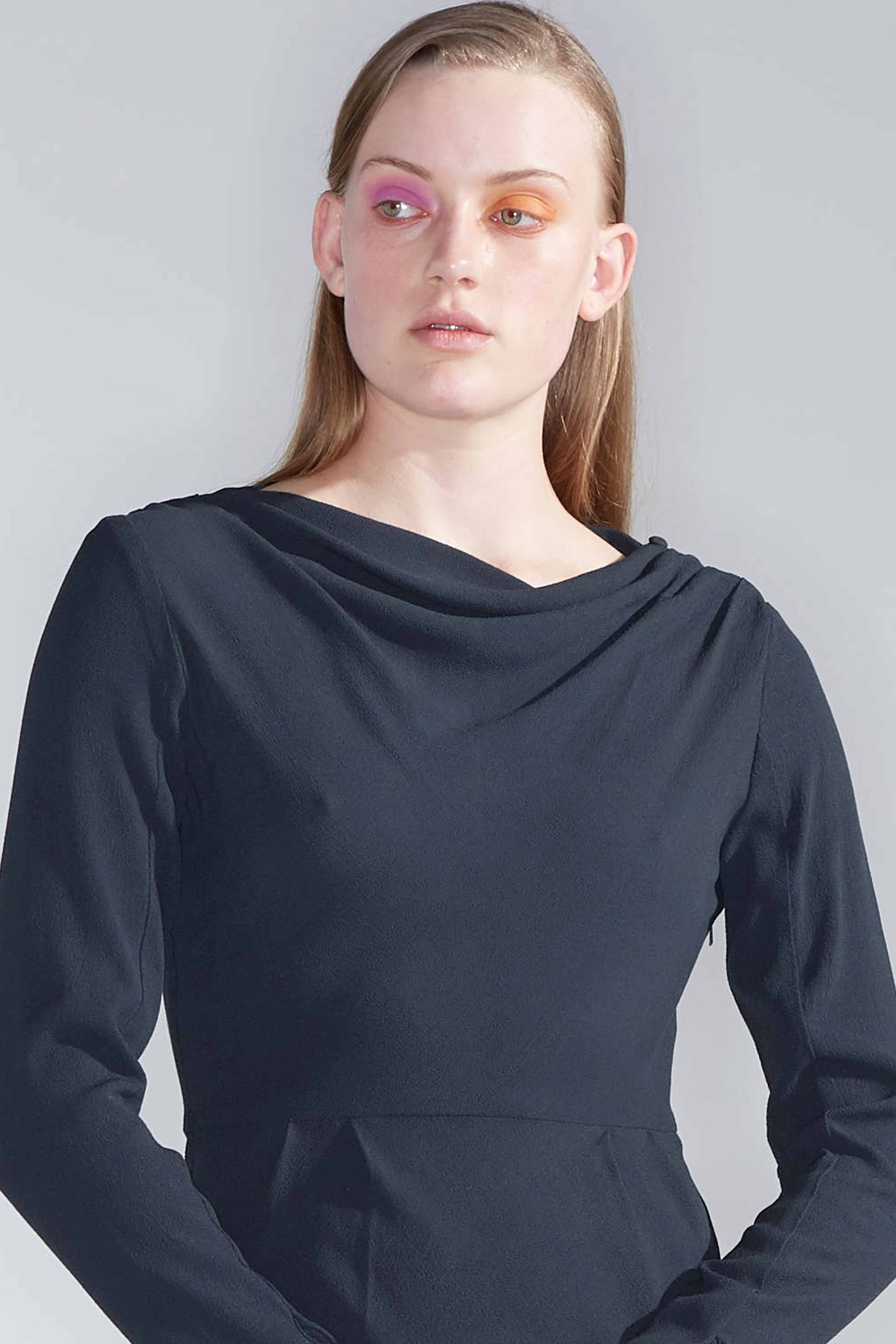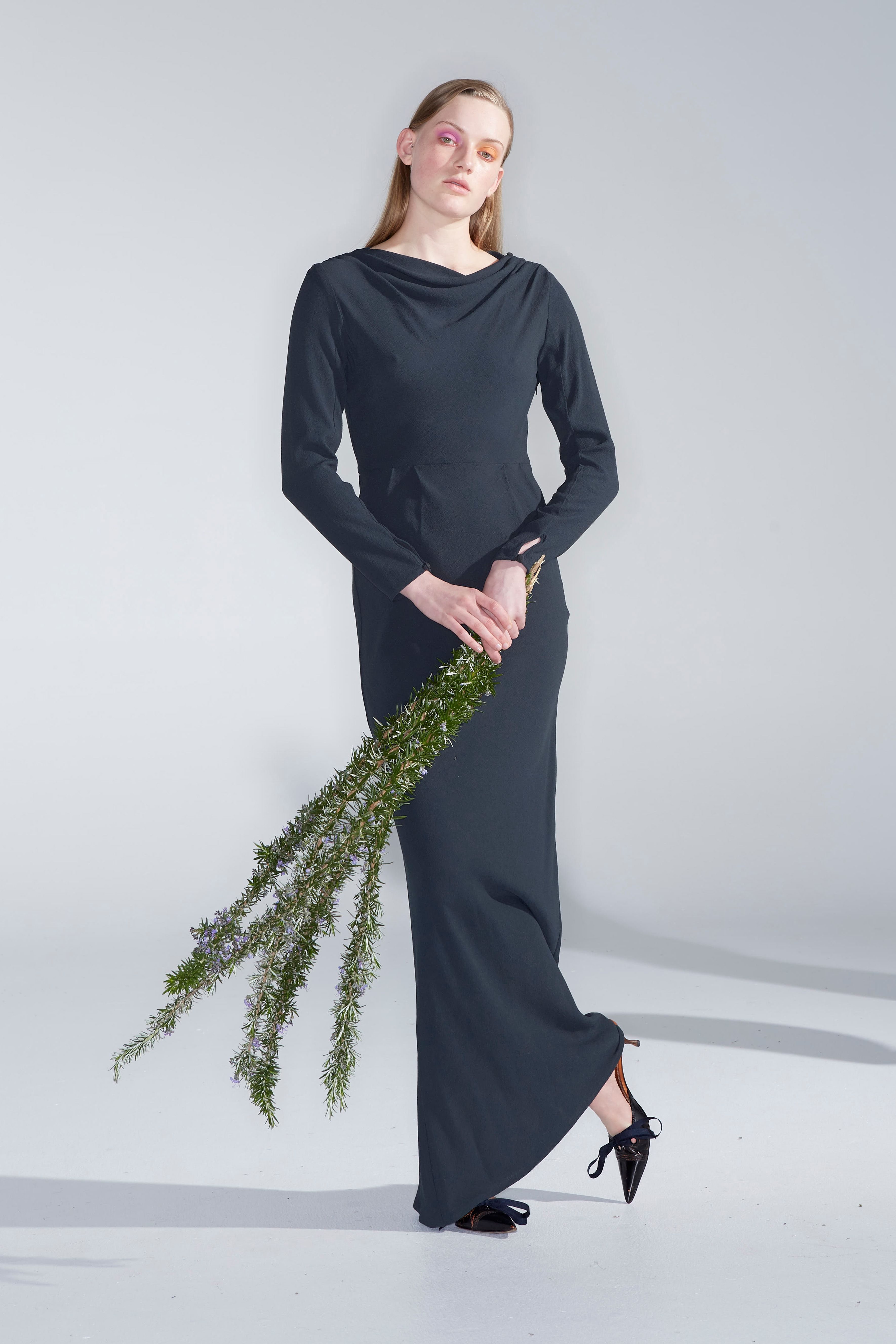 The Veiled dress shapes and drapes the body with it’s bias cut design, making it flattering for all. Soft cowl neck at the front and back with beautiful detailing of dome shank buttons and rouleau loop fastening on the left shoulder. Fitted full length sleeve. Tuck details at the front and back of the waist. Invisible zip in the side seam. Full length with the hem finishing above the ground with the option to wear with flats or heels (depending on height of the wearer).