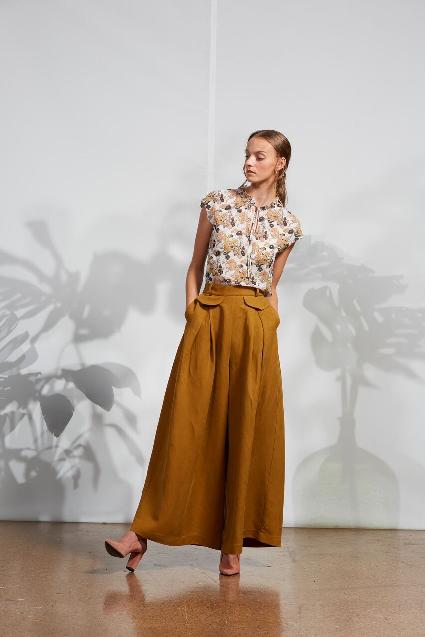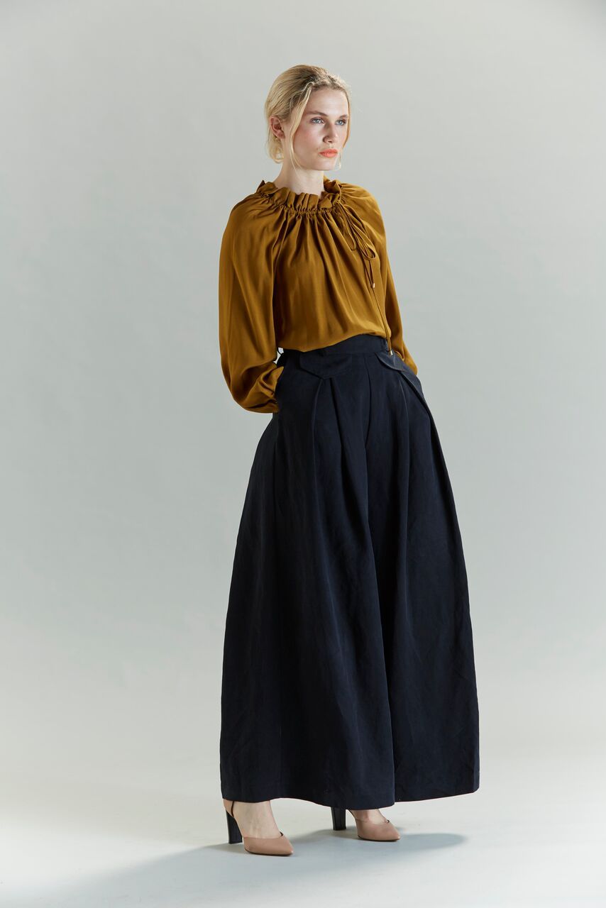 A playful shape. The Yanka pants are perfectly balanced with a high waist and wide, billowed trousers. Drapey and weighty in a linen/tencel blend. Waistband with belt loops. Triangular lapel detail sits atop single pleat which traces down each leg and creates volume. Falls to the ankle.