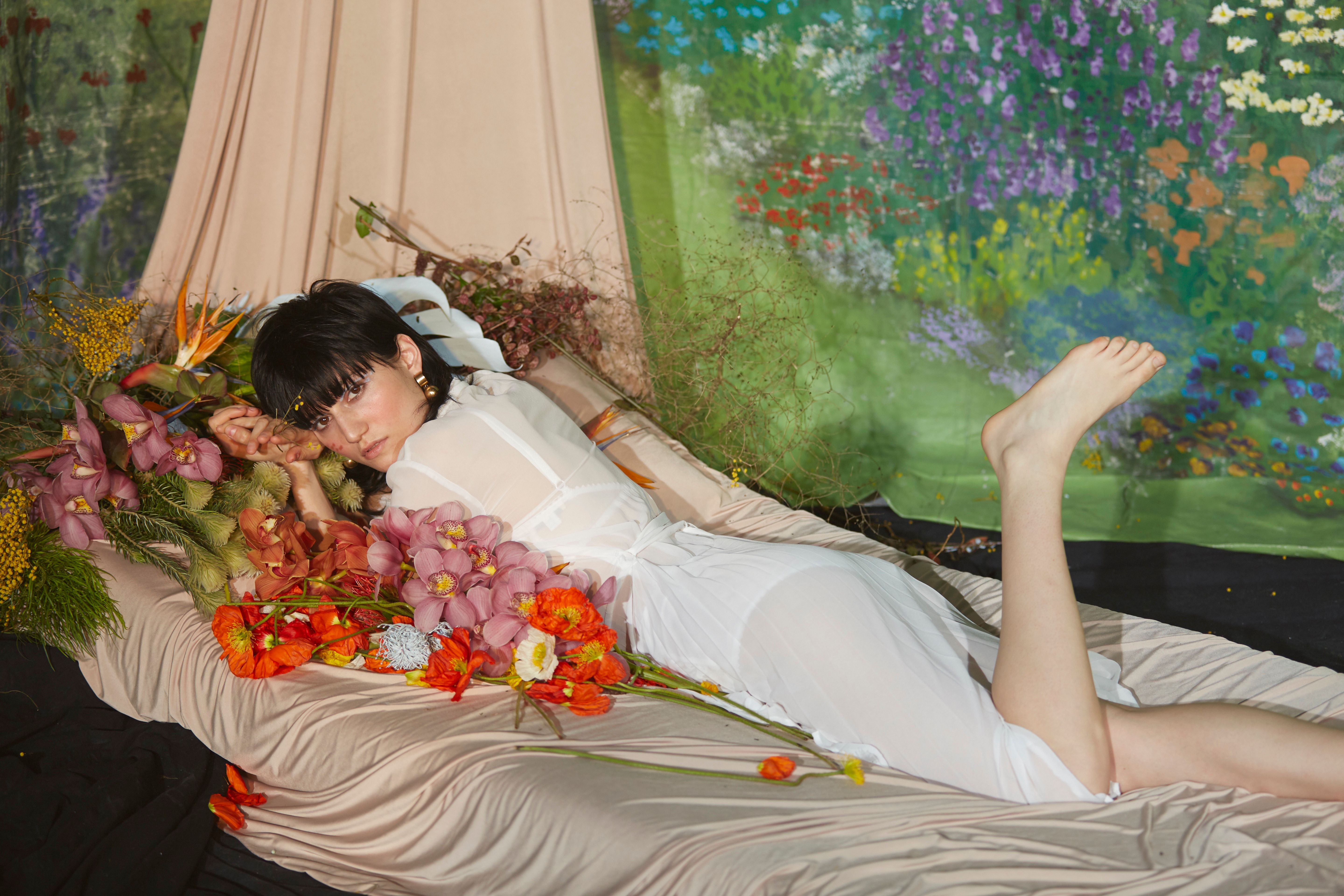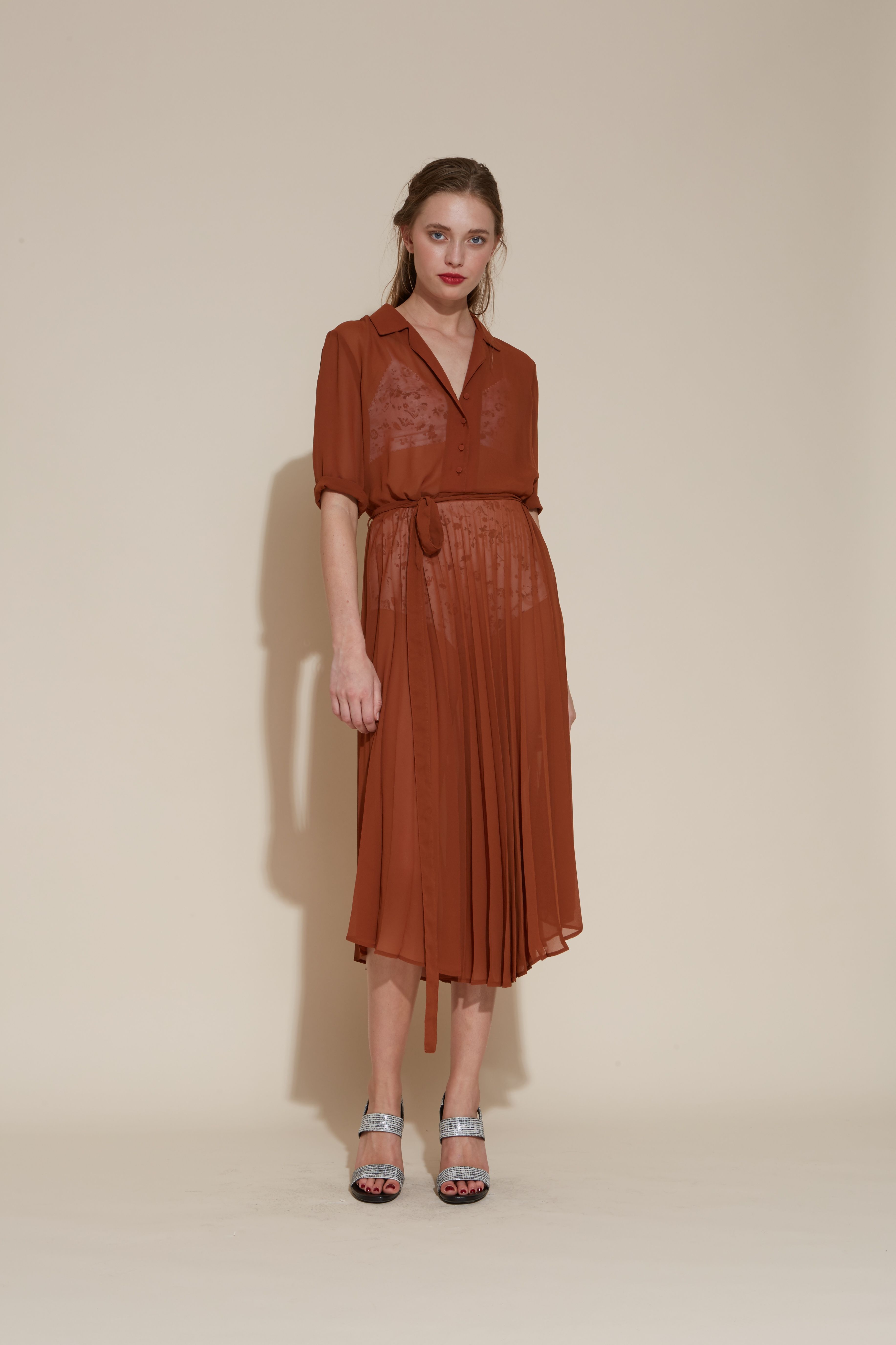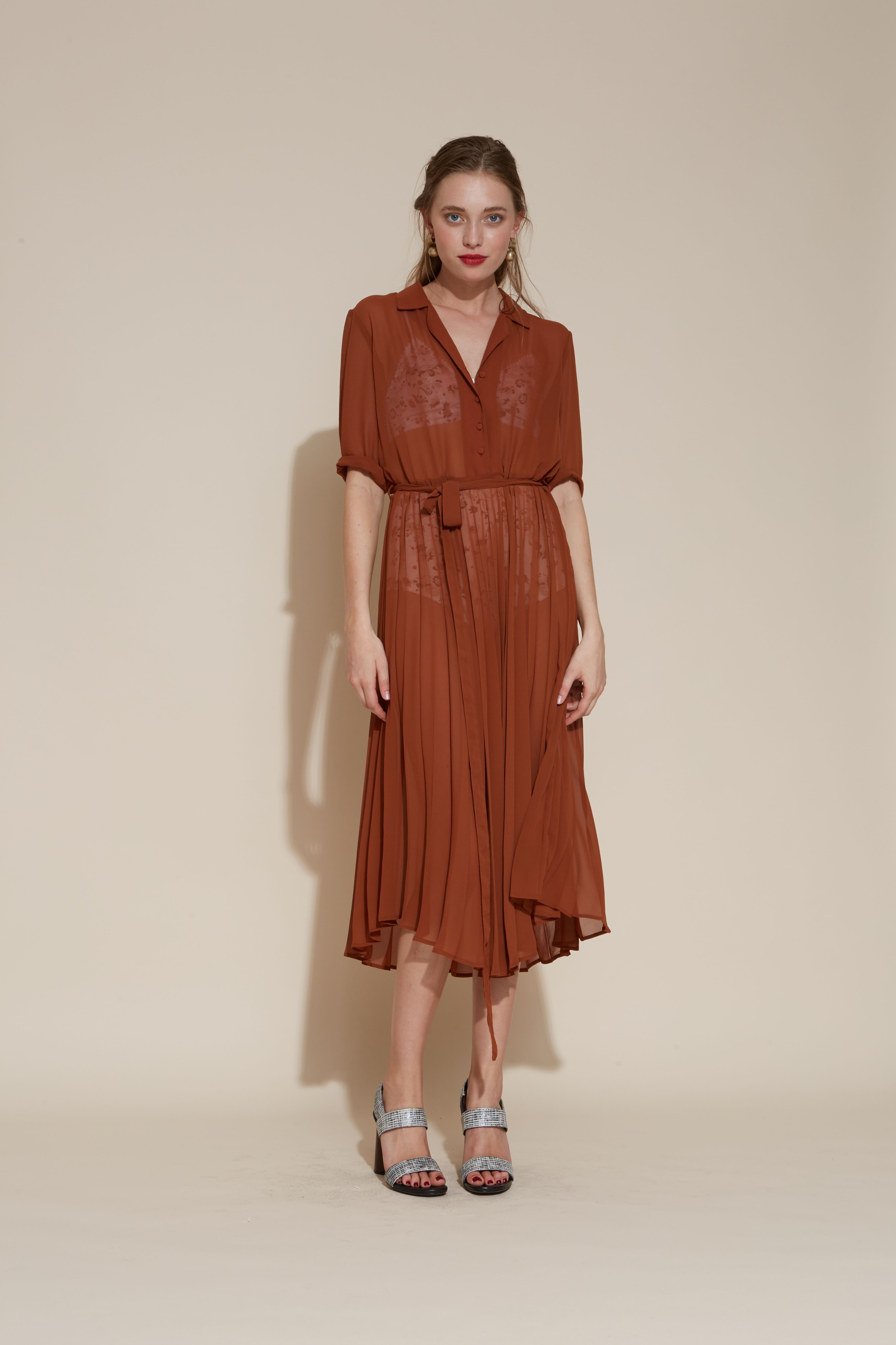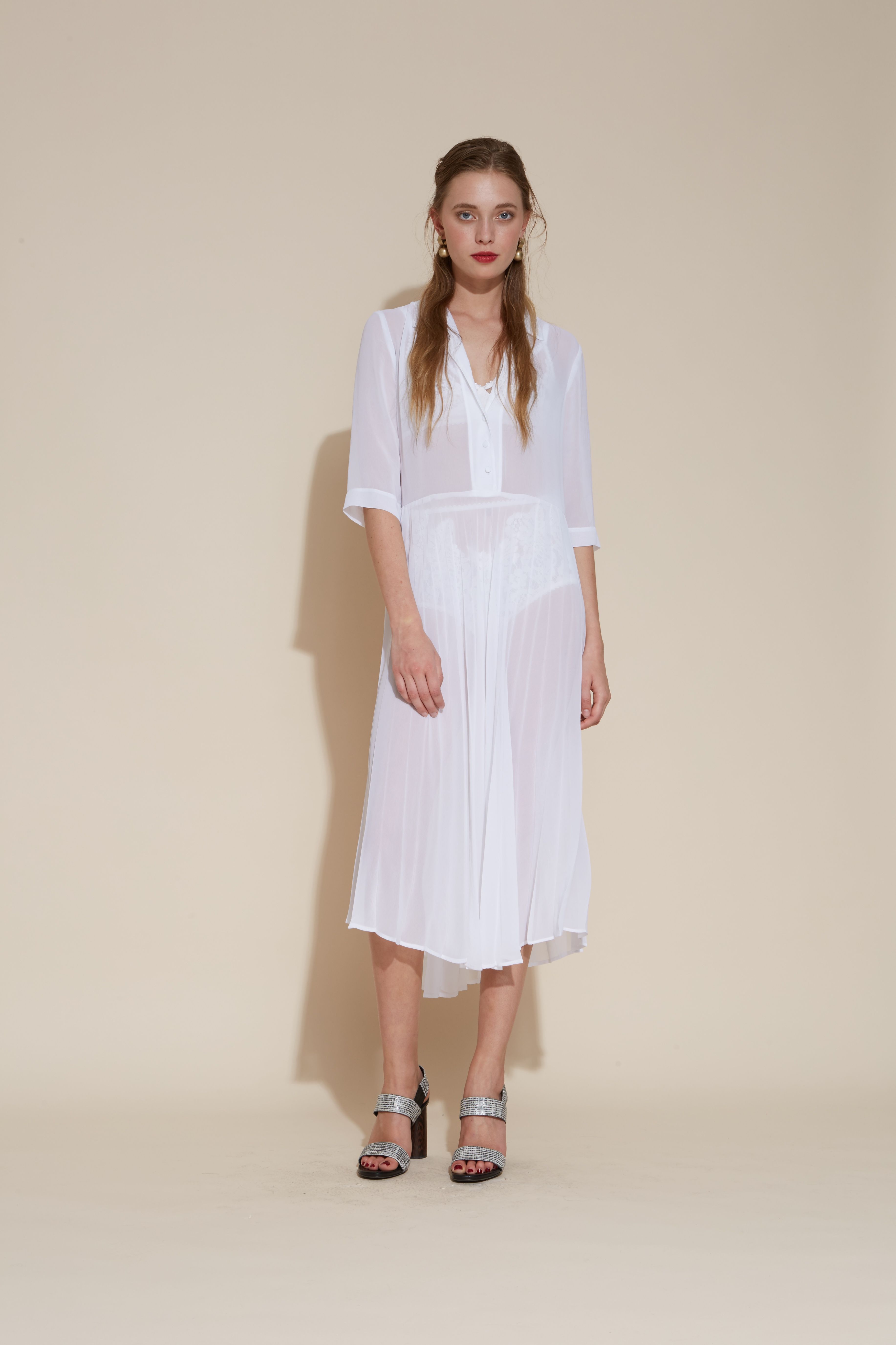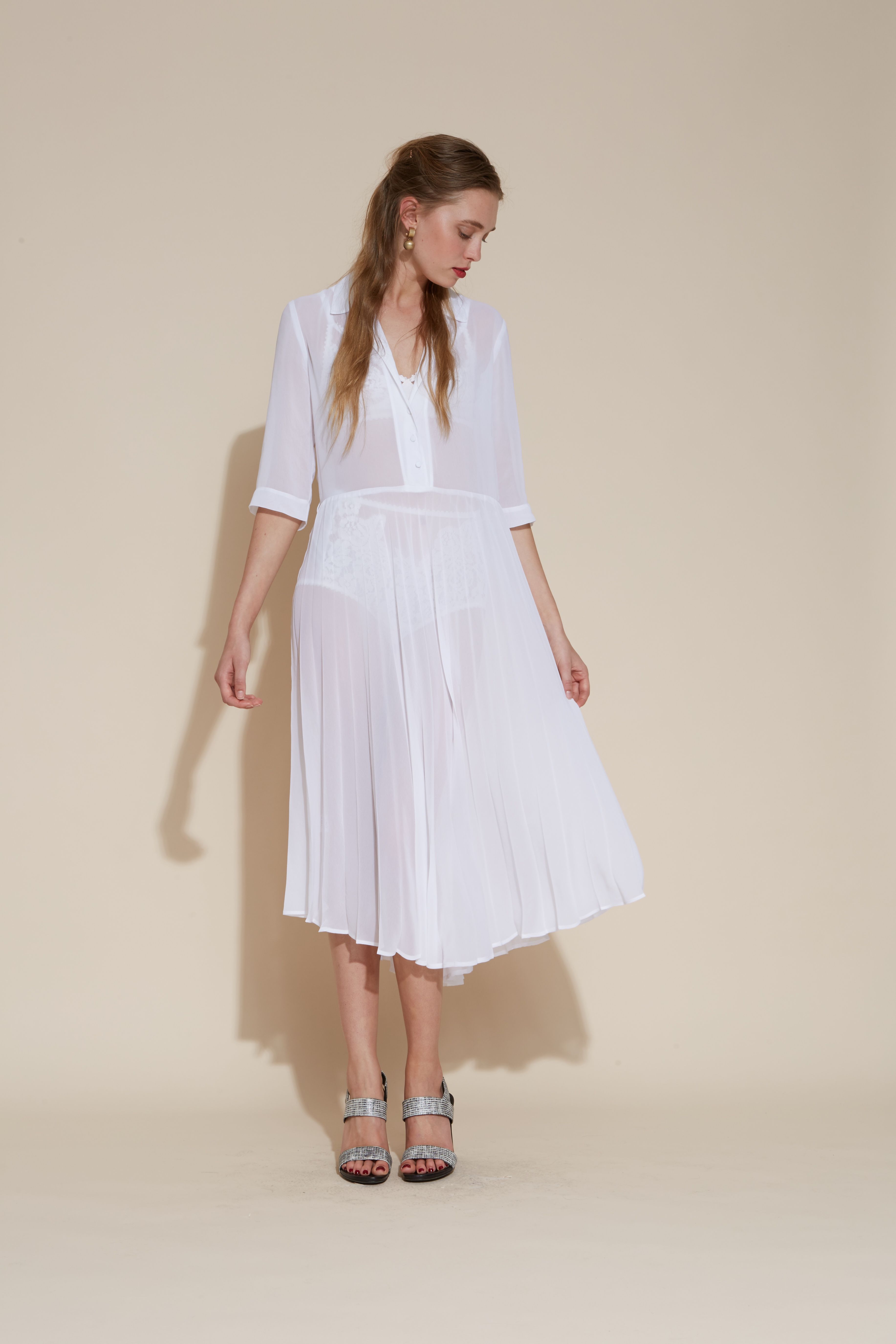 The beautifully light Yuki dress sits perfectly on the shoulders with a soft collar and button down front. Sleeves skim the elbow. Full sunray pleated skirt with a fine tie at the waist. Hem finishes mid shin.